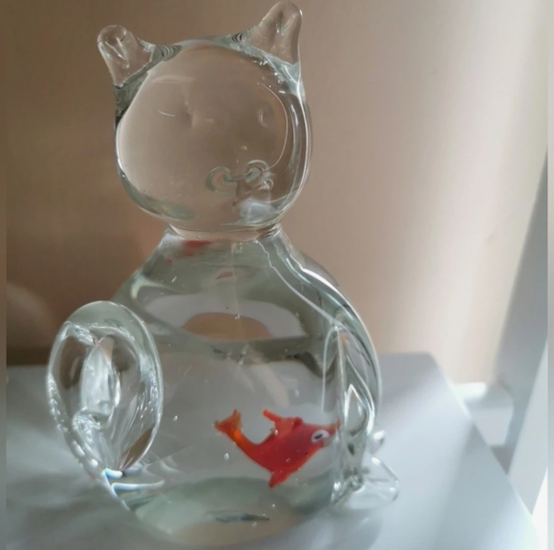 Murano glass cats with a fish inside all look different because they are handcrafted, and each piece is unique due to the variations in the glassblowing process. The handmade nature of Murano glass or Murano Style Glass ensures that even with the same design, there will be slight differences in form and color, making each piece a one-of-a-kind work of art. So two are never the same. The specific details, such as the size and position of the fish, the shape of the cat, or the presence of air bubbles, can all vary slightly from one piece to another. These variations are a sign of the handcrafted nature of the glass. Unfortunately doesn't have any stickers. In great vintage condition, heavy, about 5 inch tall.