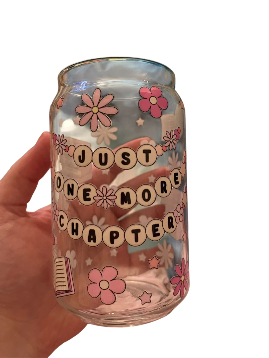 This cute glass can features a stack of books and says "Just One More Chapter". It's decorated with flowers and stars. Perfect for your morning coffee or iced tea!