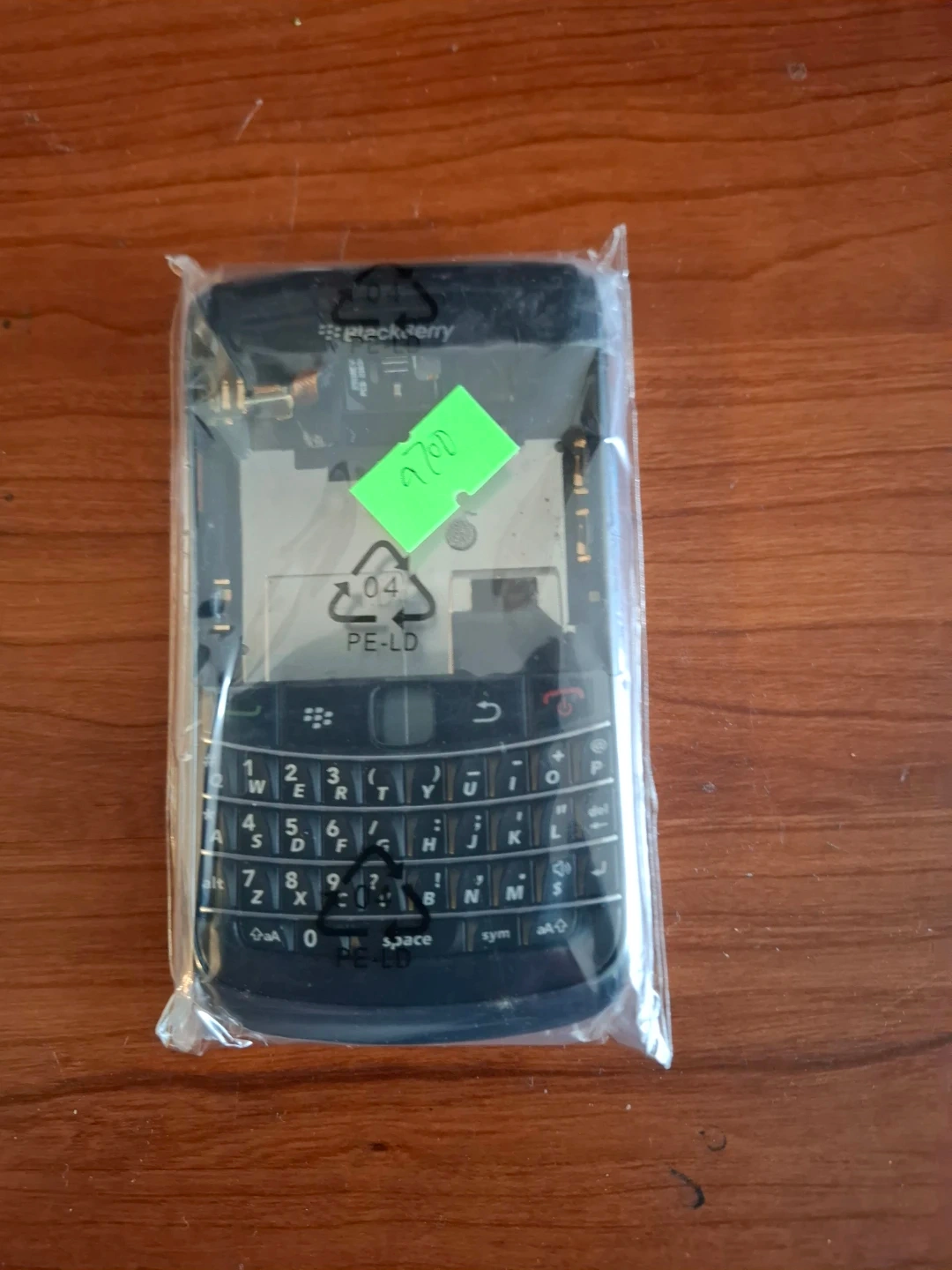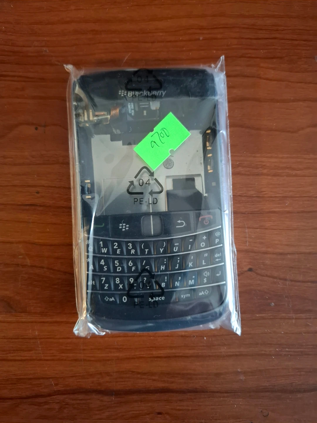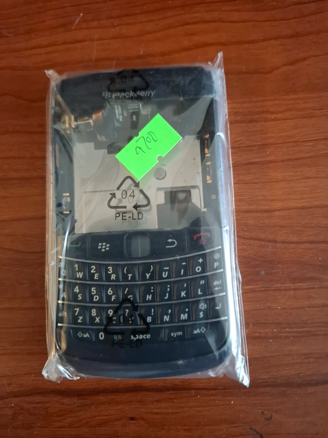 BlackBerry Bold 9700 phone housing in its original packaging. This is a replacement part for the phone's casing. It includes the front housing and the keyboard.