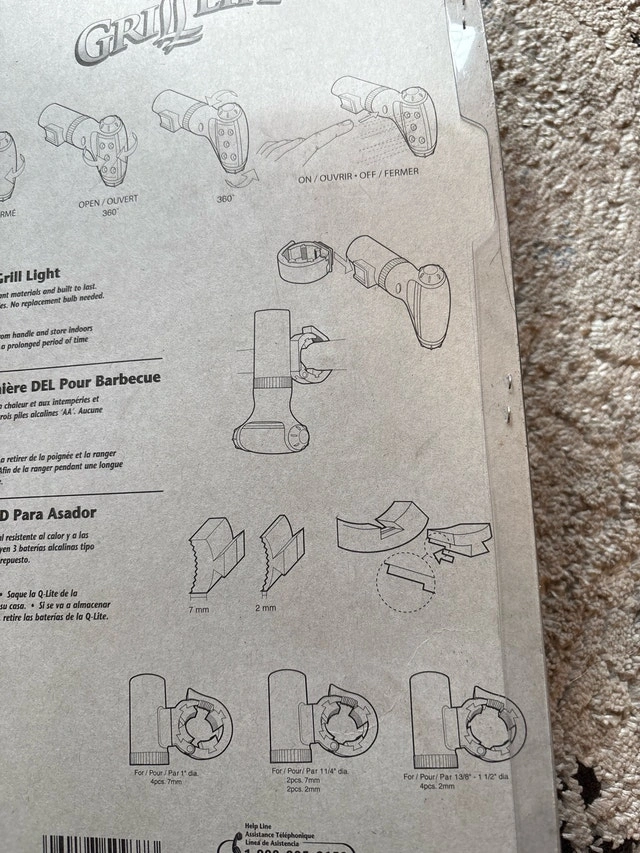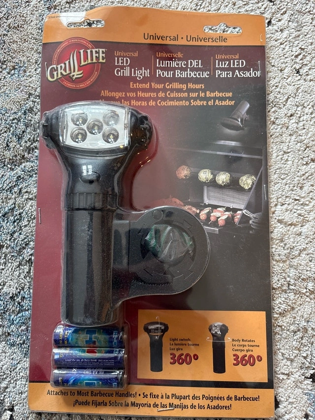 Illuminate your grilling experience with this Grill Life universal LED grill light, brand new in packaging! The light is made of heat and weather resistant materials and built to last. It includes three 'AA' alkaline batteries and no replacement bulb is needed. It attaches to most barbecue handles, the light swivels 360 degrees, and the body rotates 360 degrees. Cash accepted.