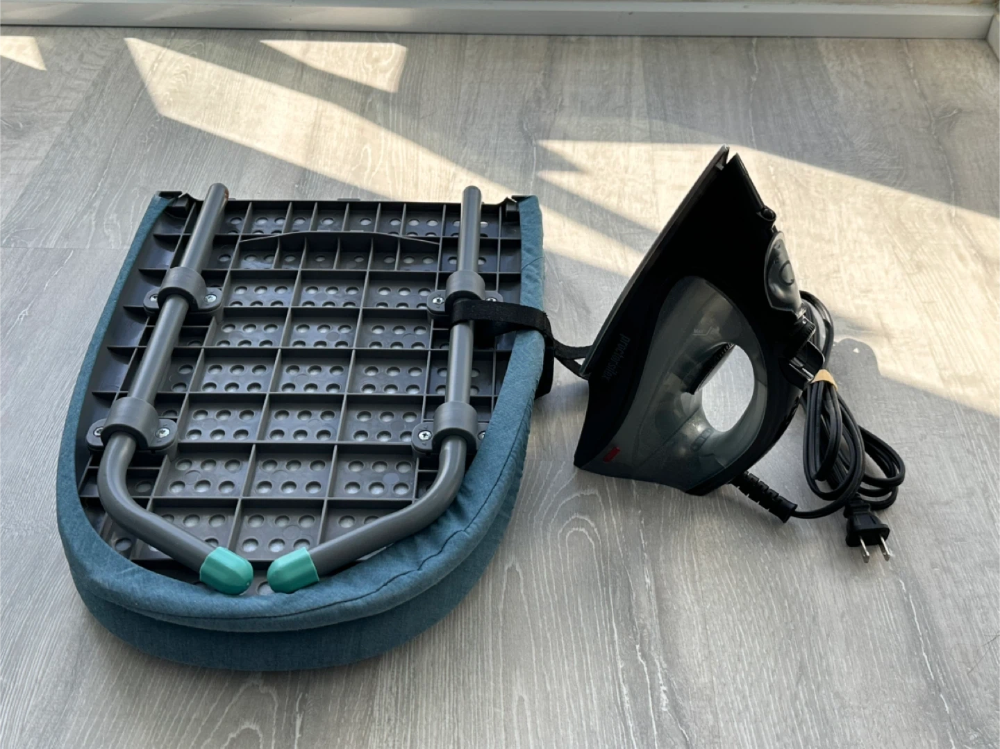 Black Proctor Silex iron with a teal collapsible ironing board. Board has a sturdy grey metal frame with fabric cover. Includes power cord for iron.
