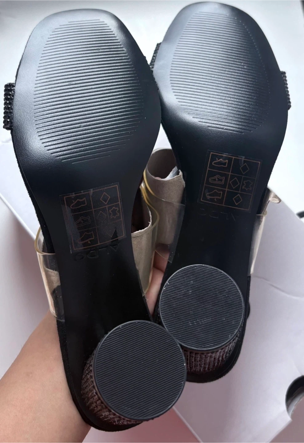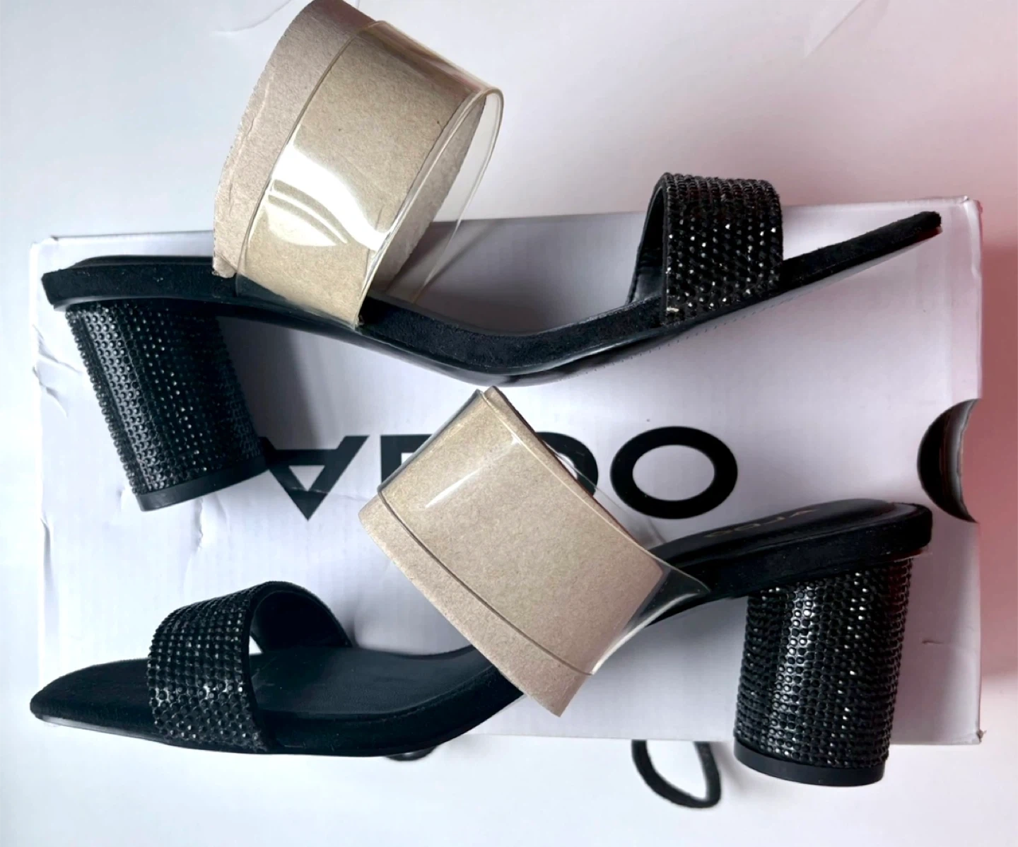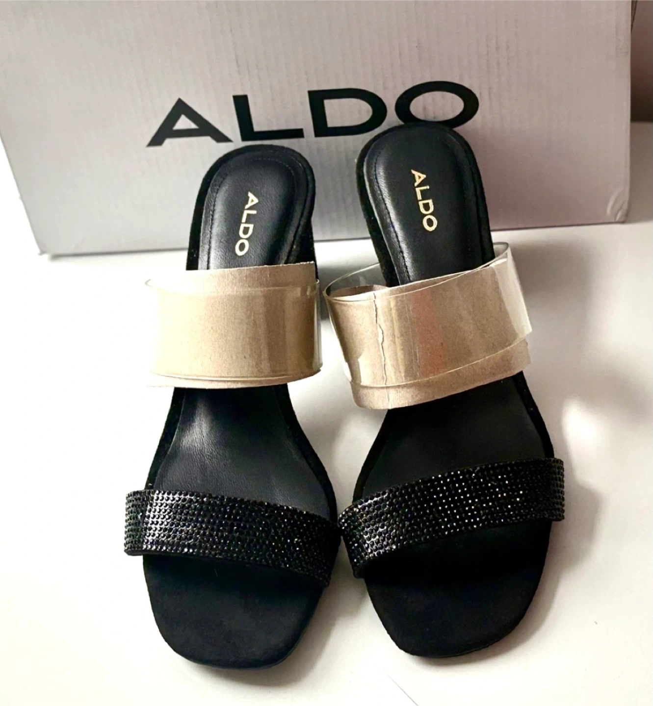 ALDO Black Mules with Rhinestone Strap and Clear Band
