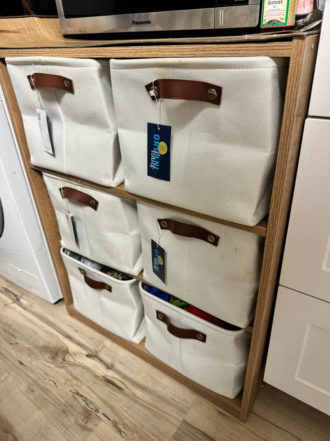 I'm selling 6 Vitality storage bins! They're in excellent condition and perfect for organizing any space. They are light brown and have brown handles. All 6 at awesome price!