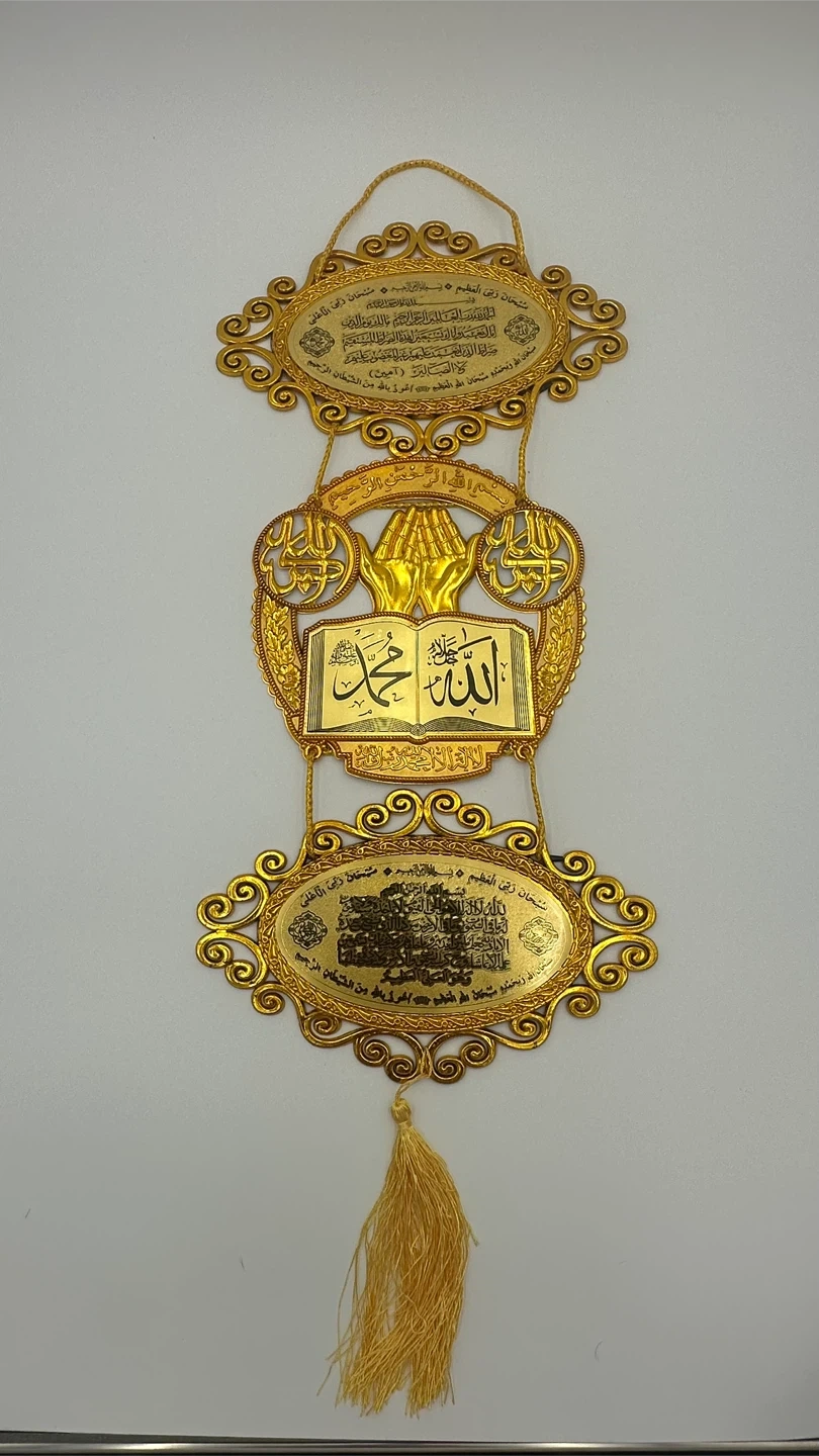 This is a beautiful gold-coloured Islamic wall hanging featuring Arabic calligraphy. It has three decorative panels with intricate designs. Includes a decorative tassel.