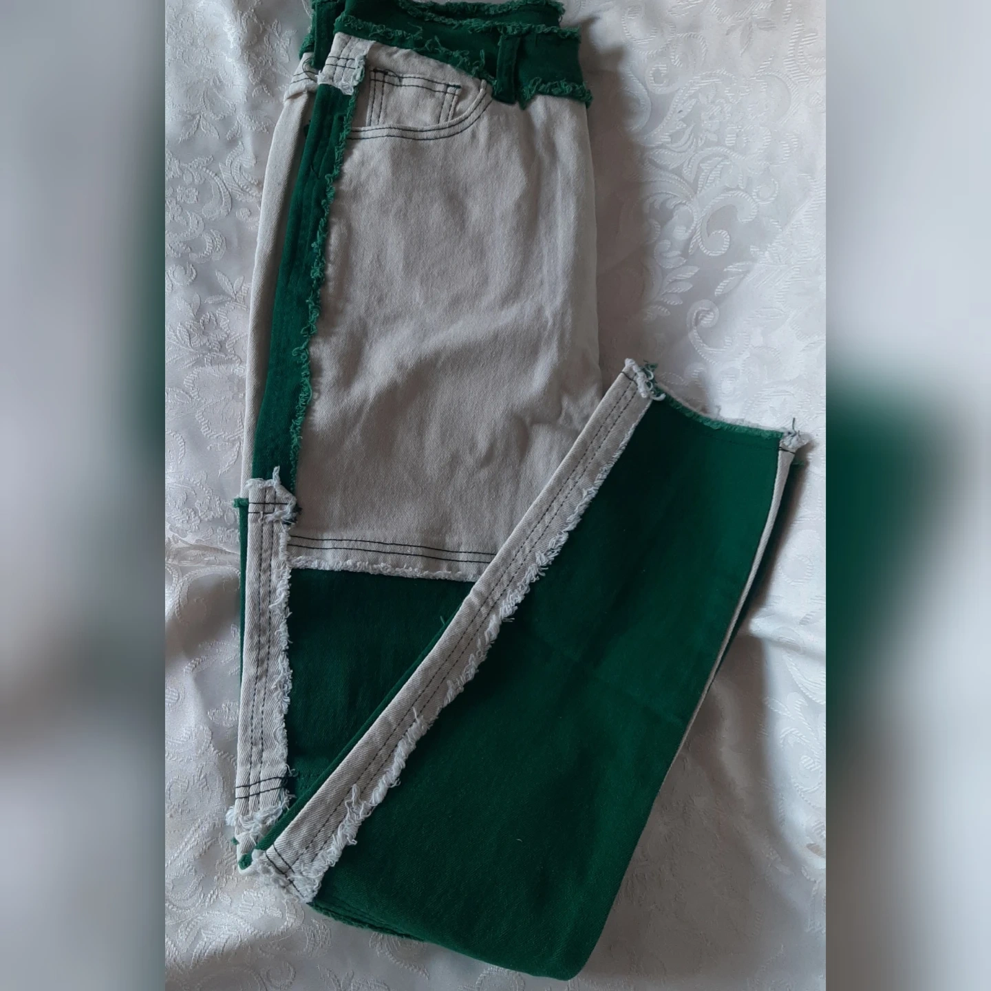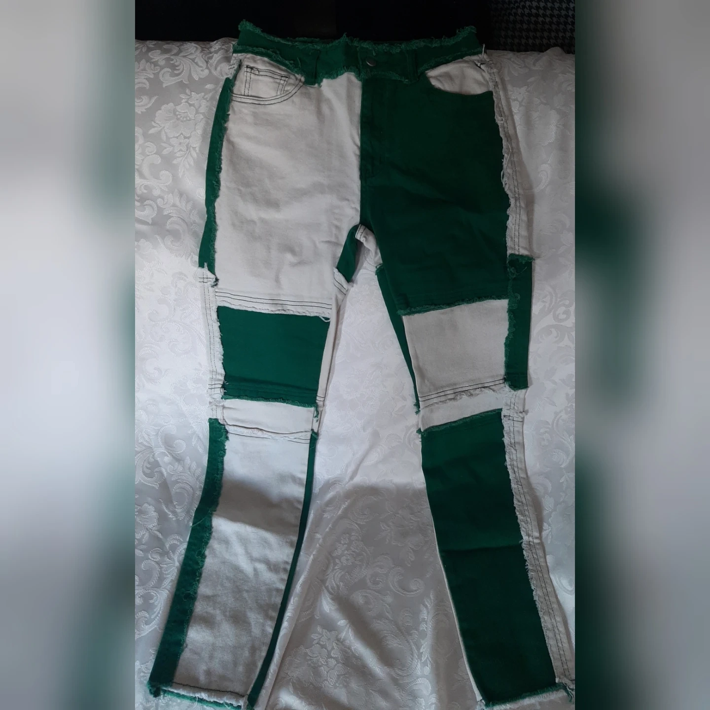 These unique patchwork jeans feature a two-tone design with green and off-white panels. They're finished with frayed hems for a stylish, deconstructed look. Denim material.
