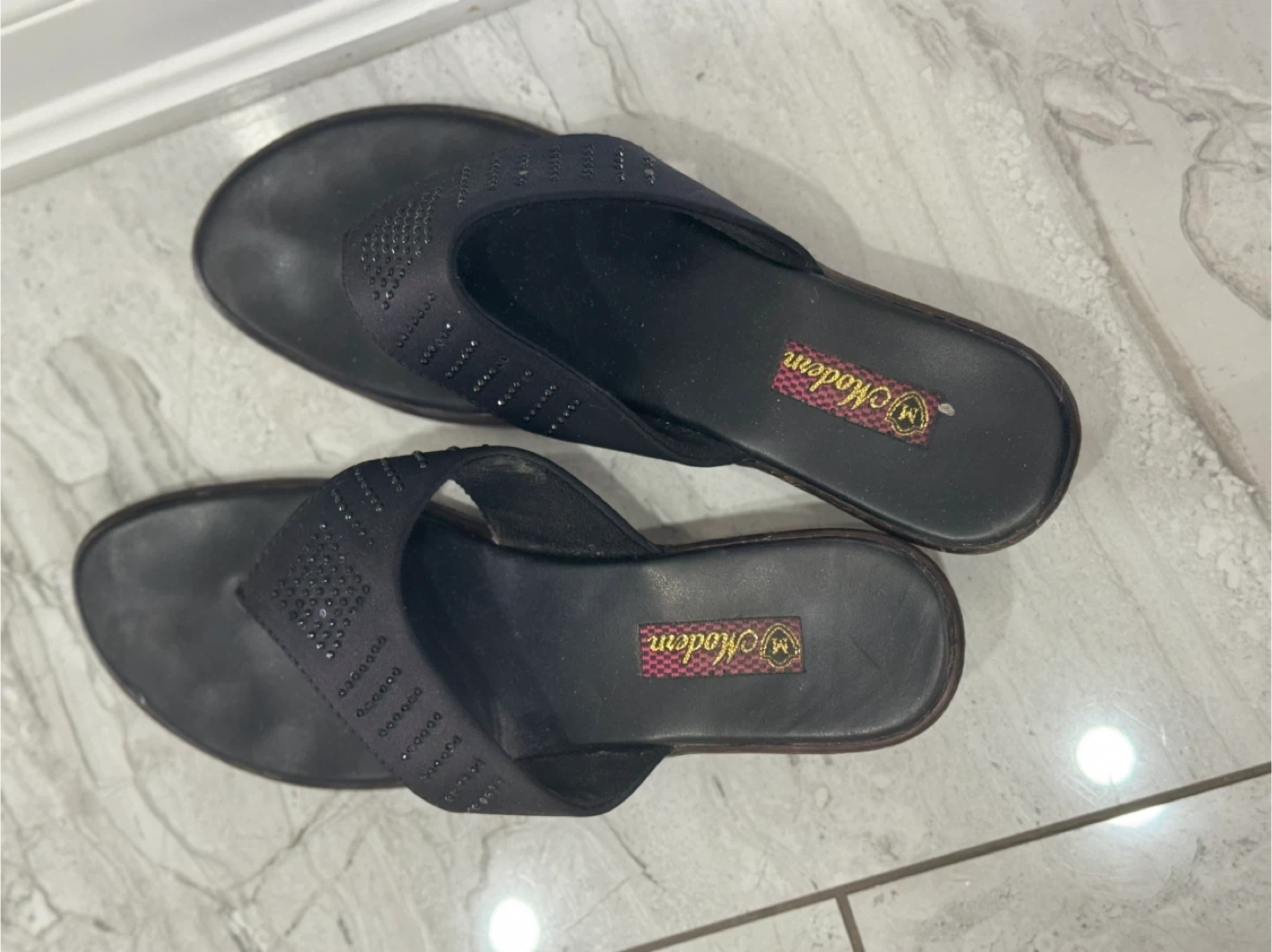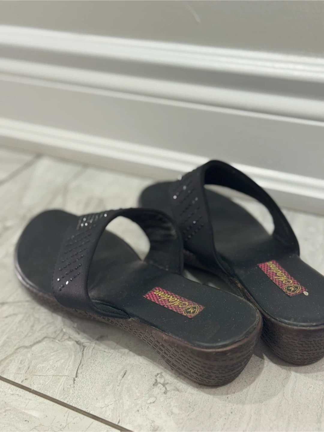 These black wedge sandals are perfect for adding a bit of height and sparkle to your summer outfits! They have a comfortable wedge heel and a stylish design with small rhinestones. They are woman’s size 8 and perfect for gifting to someone!