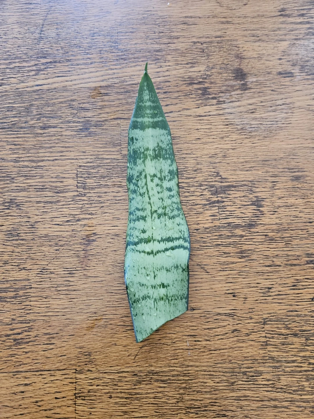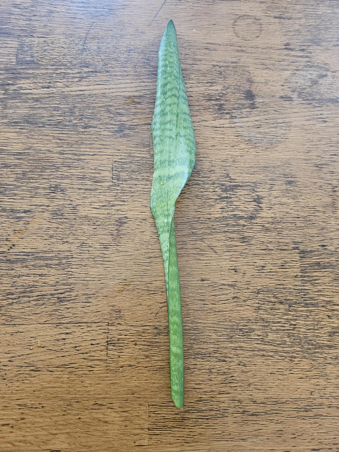 This is a healthy leaf cutting from a snake plant, perfect for propagation. It's a great way to start your own houseplant collection. The leaf is green with distinctive darker green banding.