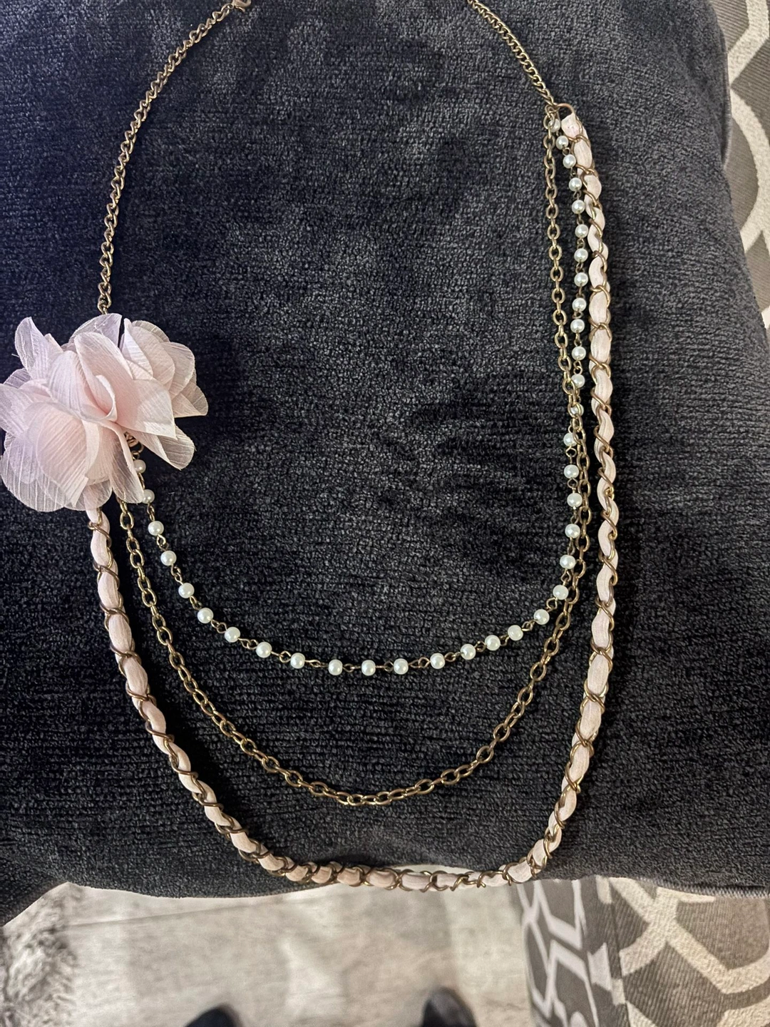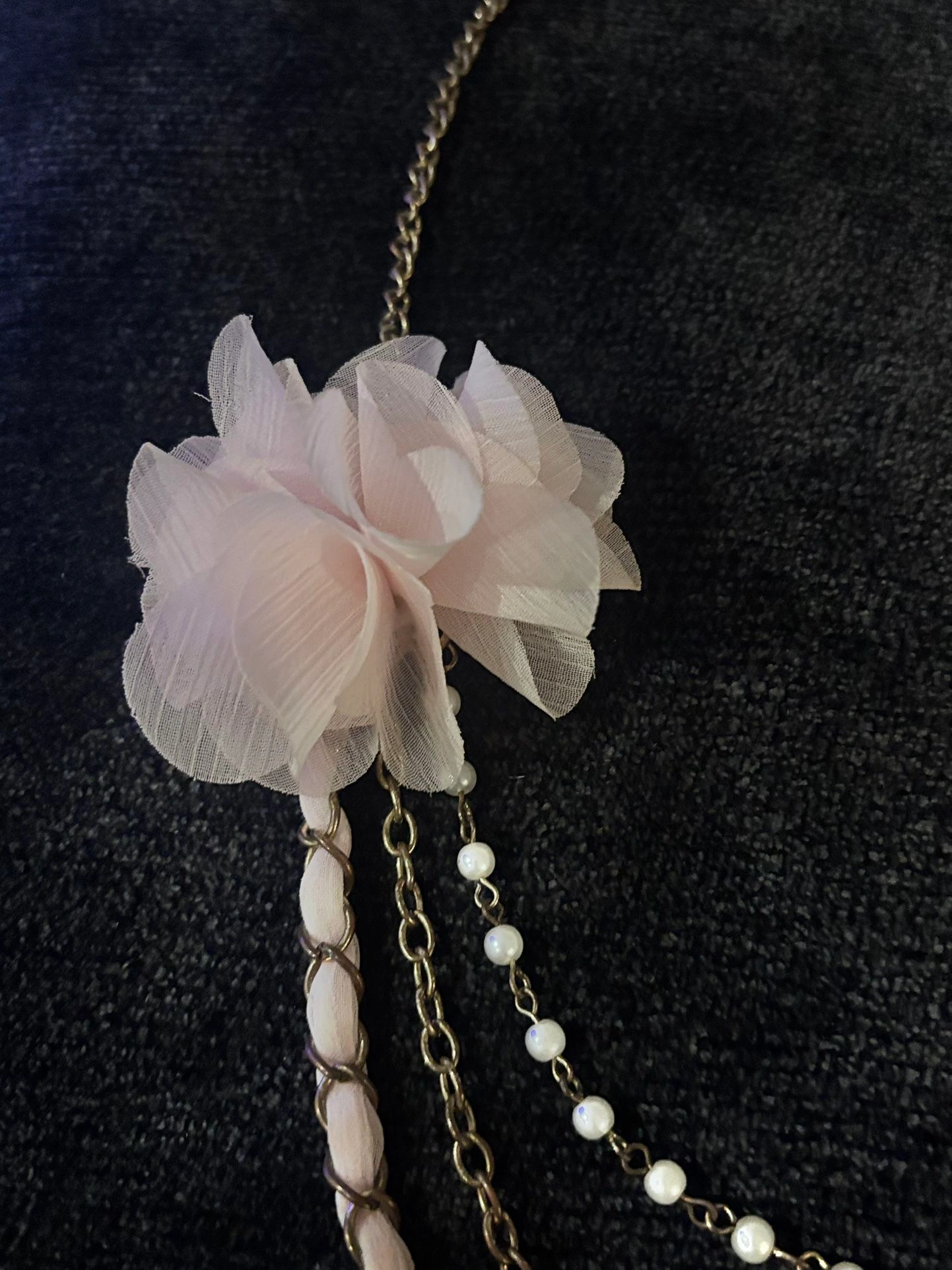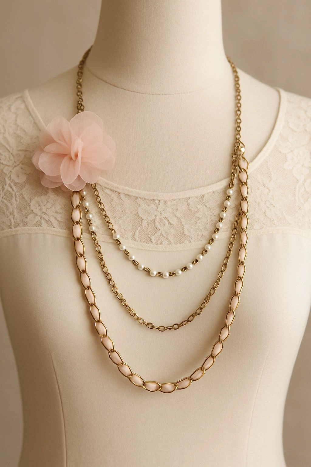 Add a touch of soft vintage romance to any outfit with this beautiful layered chain necklace, featuring a delicate blush fabric flower accent and faux pearl detailing. This piece captures a timeless, feminine aesthetic that’s perfect for lovers of vintage, cottagecore, and romantic styles. The gold-tone chains are layered for dimension, and the floral accent adds a unique statement while remaining lightweight and wearable.