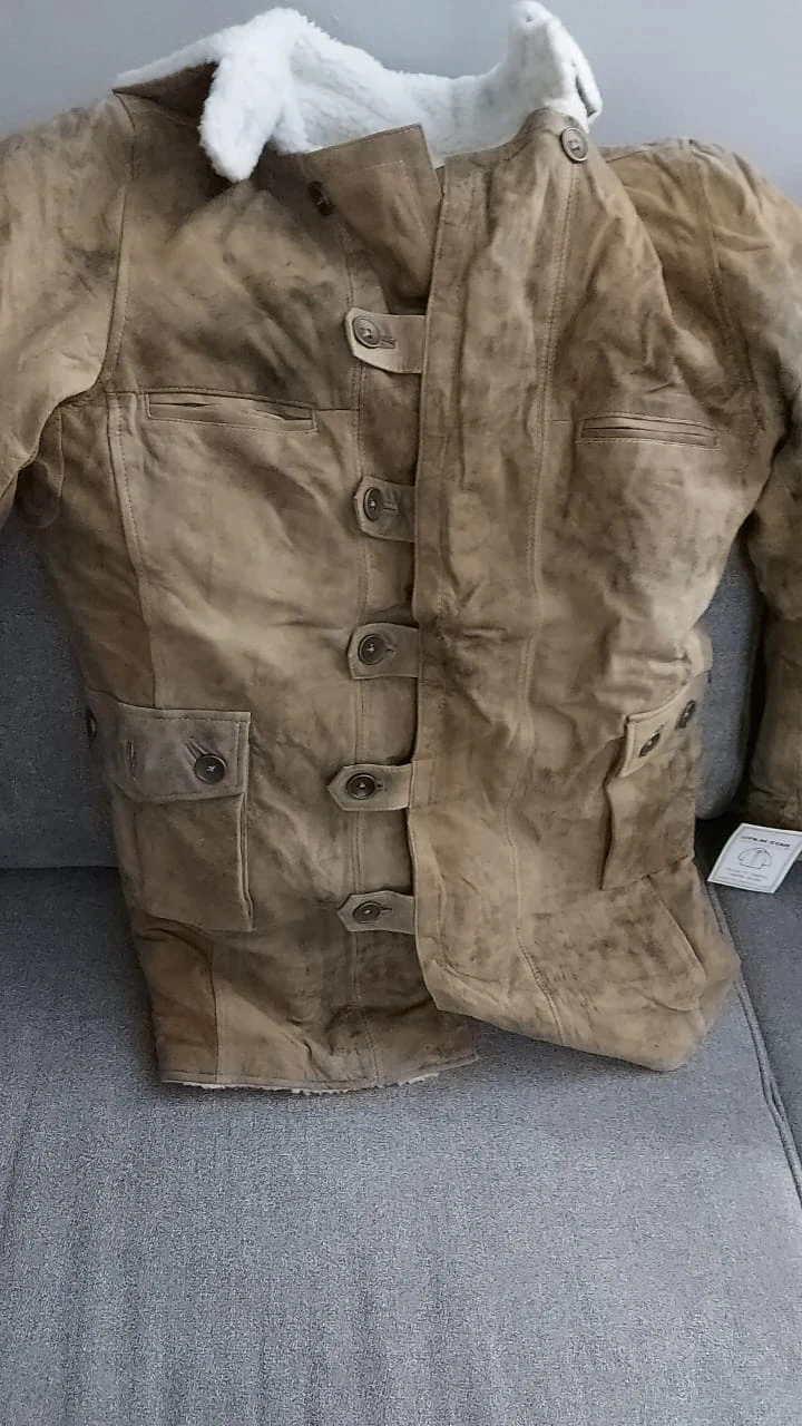 Classic men's suede jacket with a warm sherpa lining. It features multiple button closures and flap pockets. Suede material with a cozy white sherpa collar and lining. This jacket's great for staying warm.