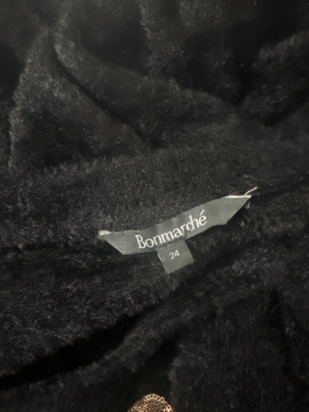 This Bonmarché sweater is black and features a gold sequin bow design. It's a size 24. The material is soft and fuzzy, making it cozy for cooler weather.