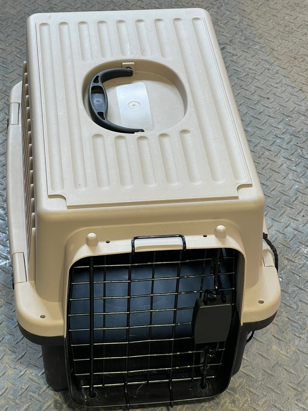 A beige and black plastic pet carrier with a wire door. It's suitable for small to medium pets. This carrier's design allows for good ventilation. It's great for vet visits or travel!