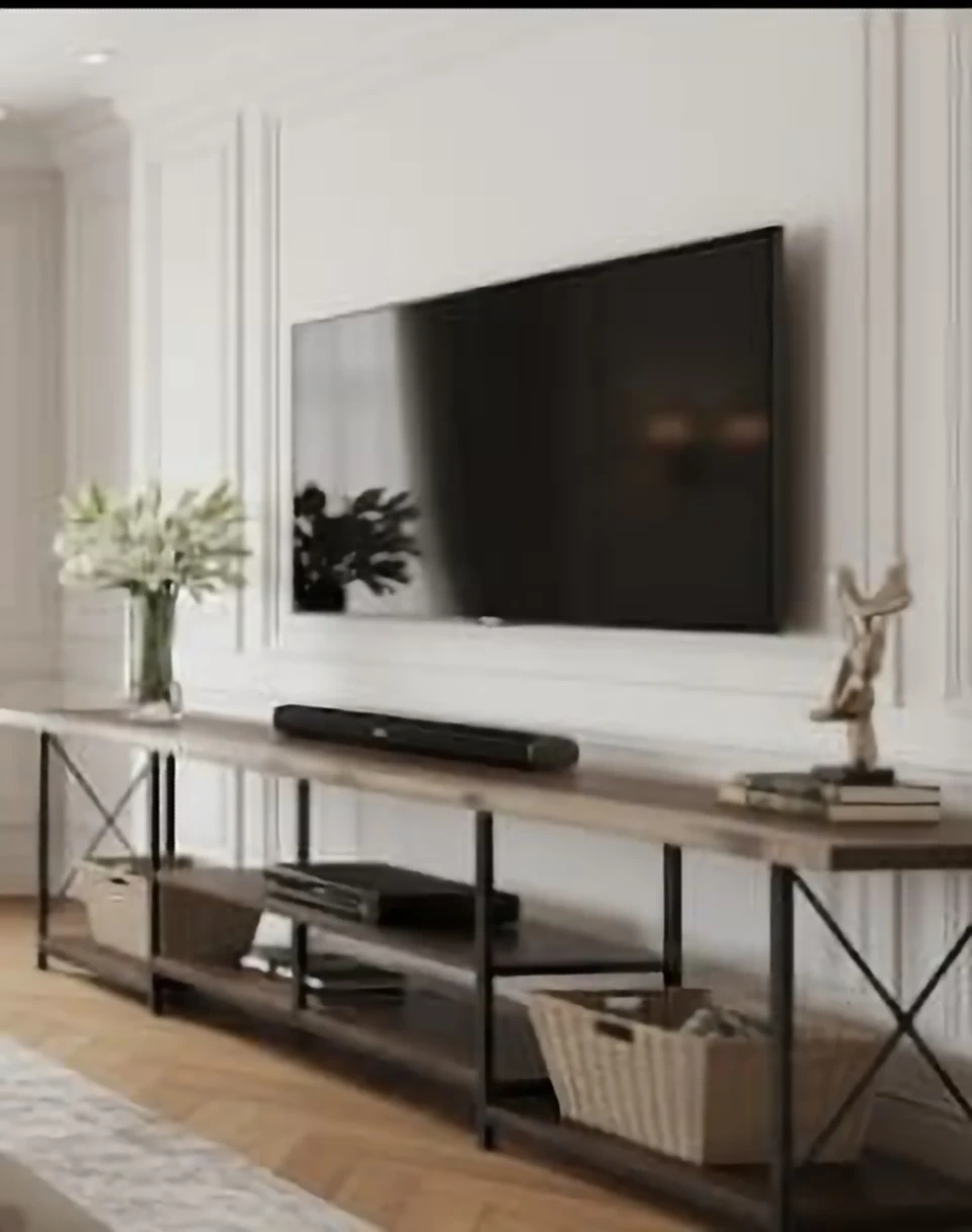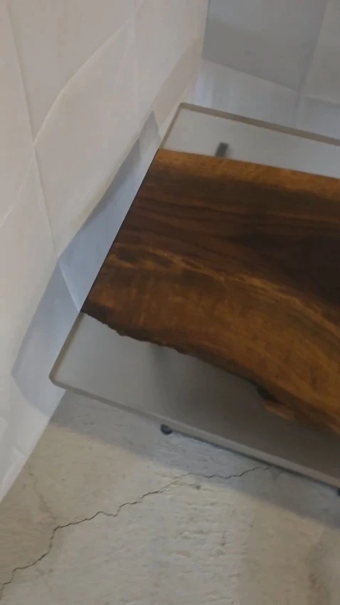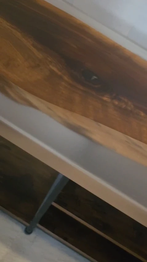 This WOOD and EPOXY T.V stand features a rustic wood top and a durable black metal frame with cross detailing. It includes open shelves for storage or display. It's perfect for a living room or bedroom.