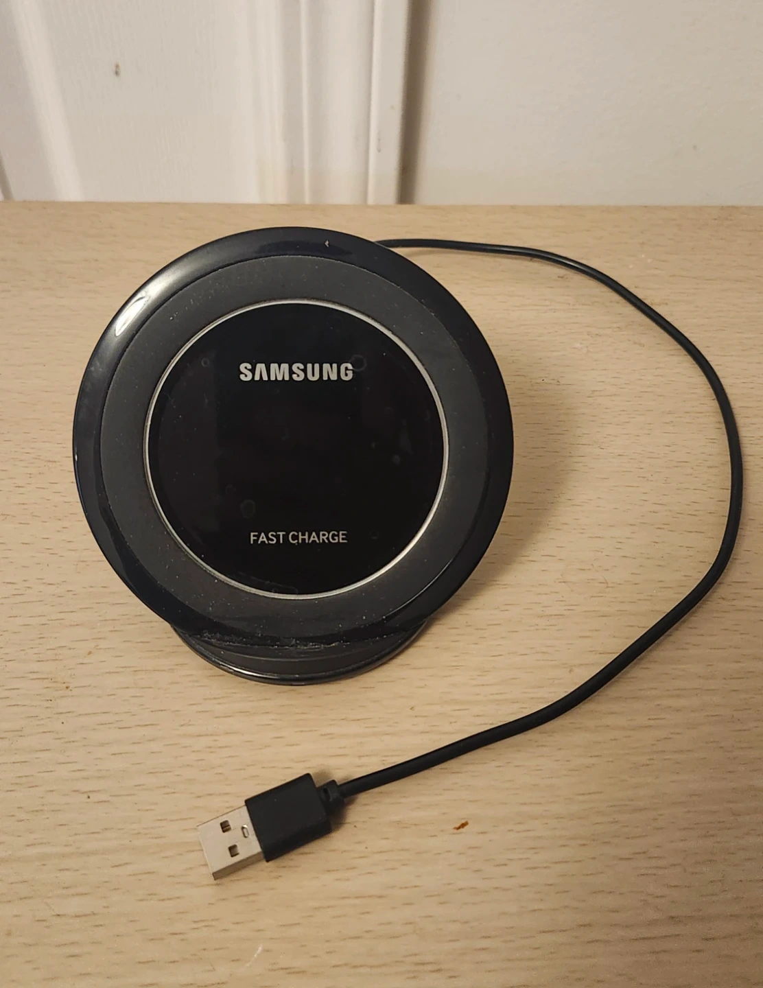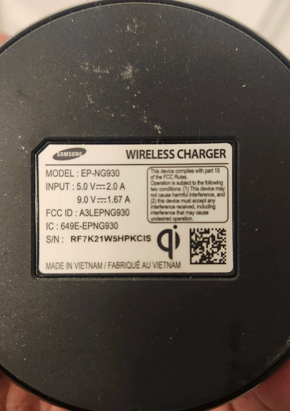 Samsung wireless charger, model EP-NG930. Fast charge capable. Includes USB cable. Made in Vietnam.