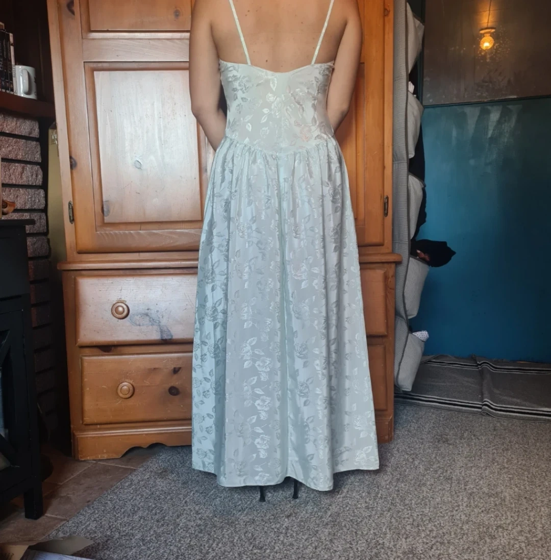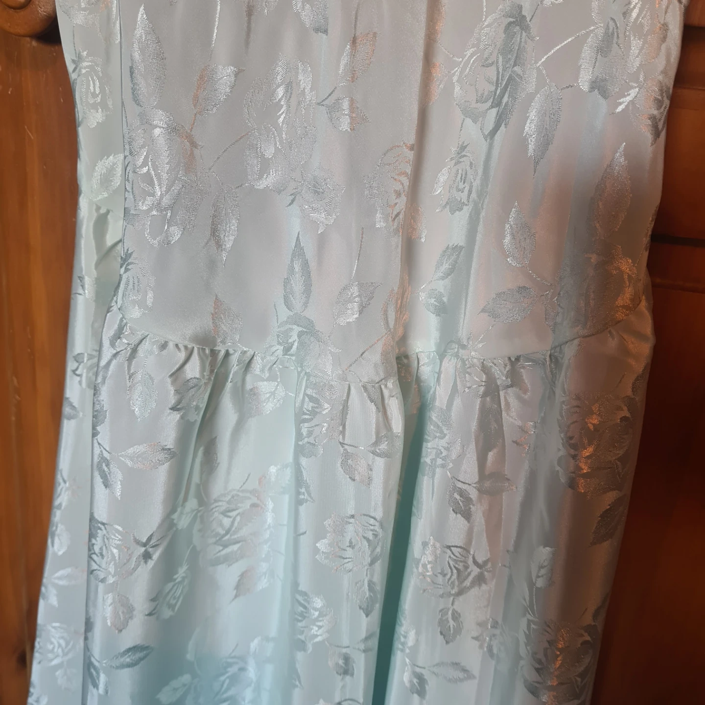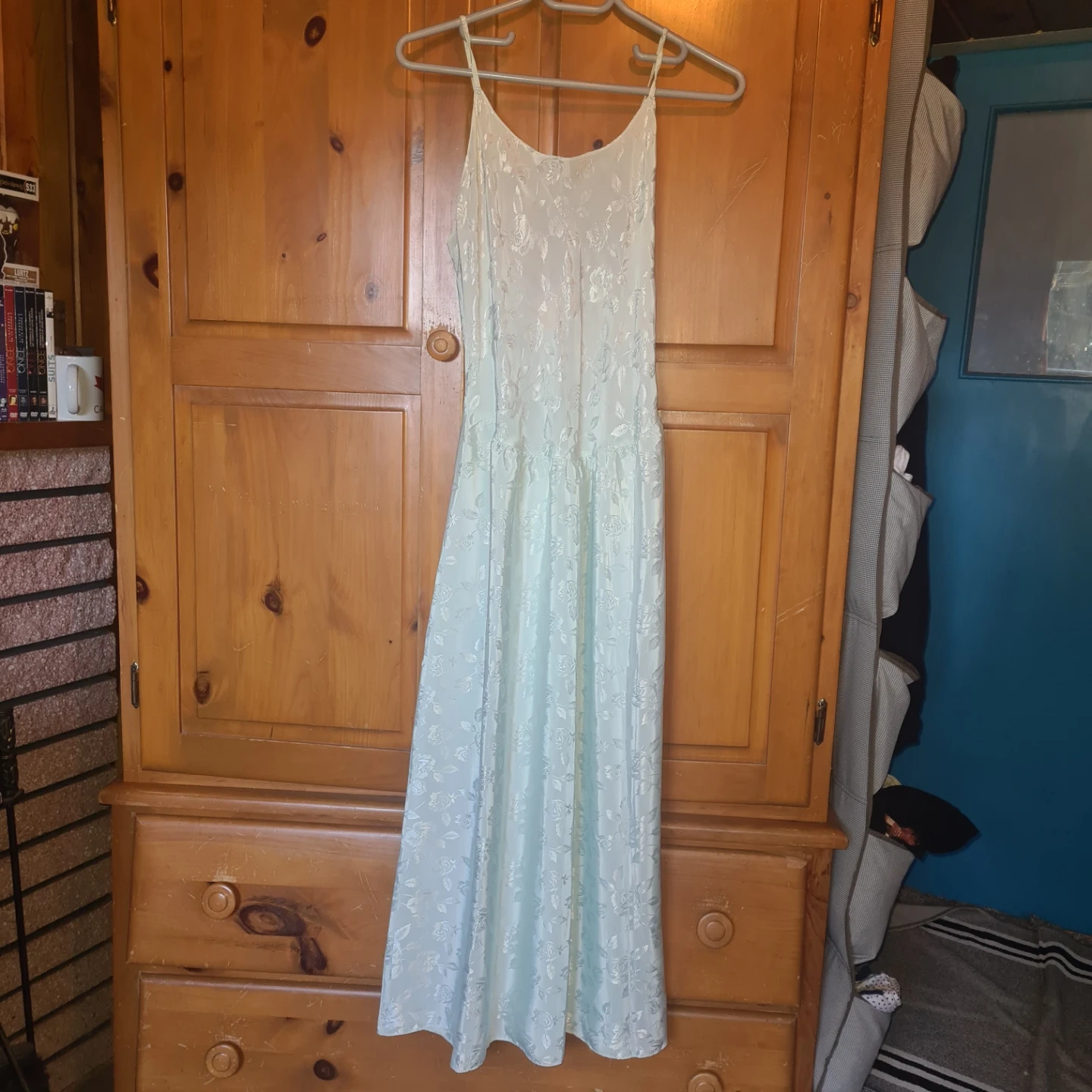 A light blue maxi dress with a delicate floral pattern from the brand ST MICHAEL (UK). It features thin spaghetti straps and a flowing skirt. Fabric composition is polyester.