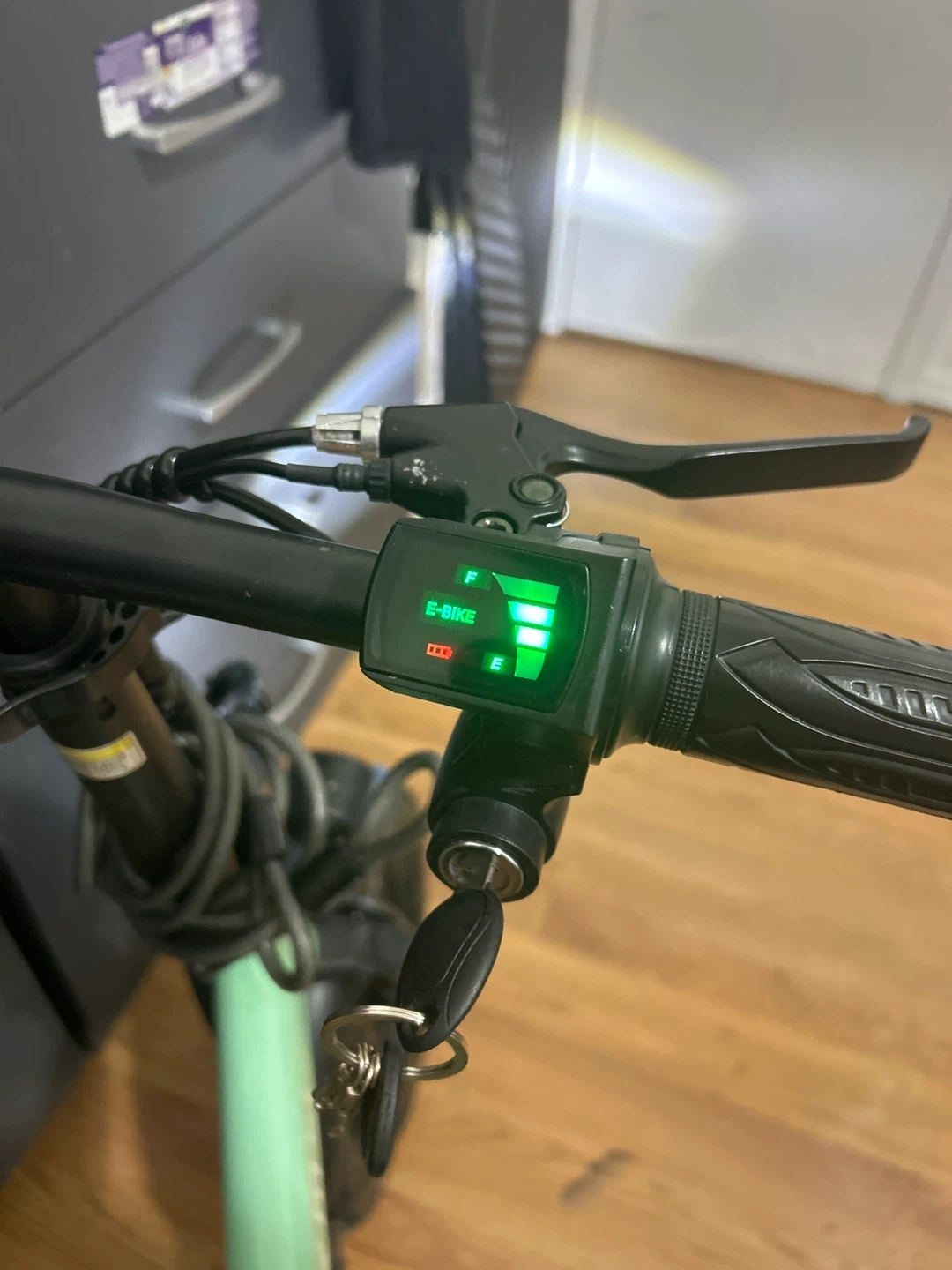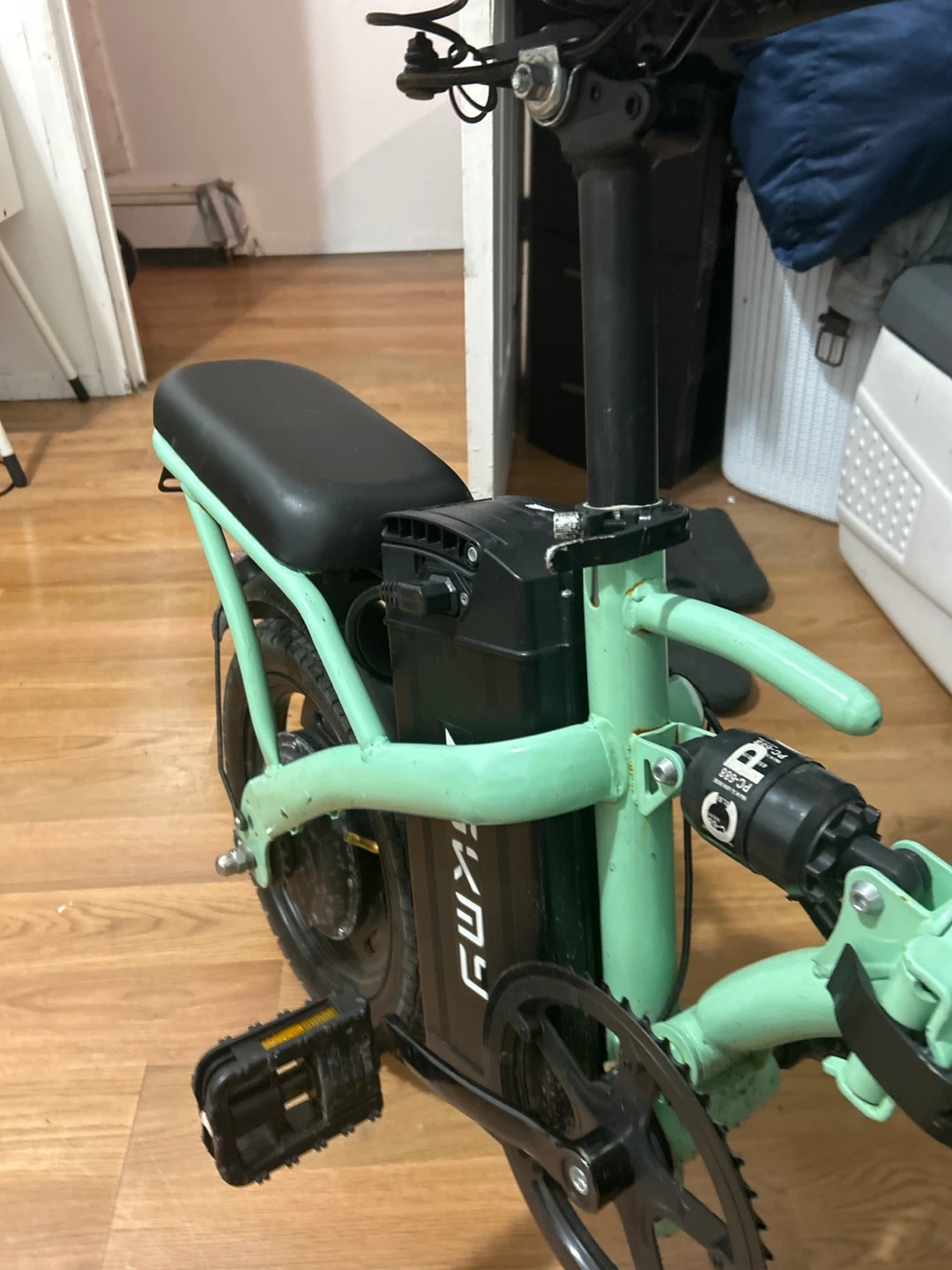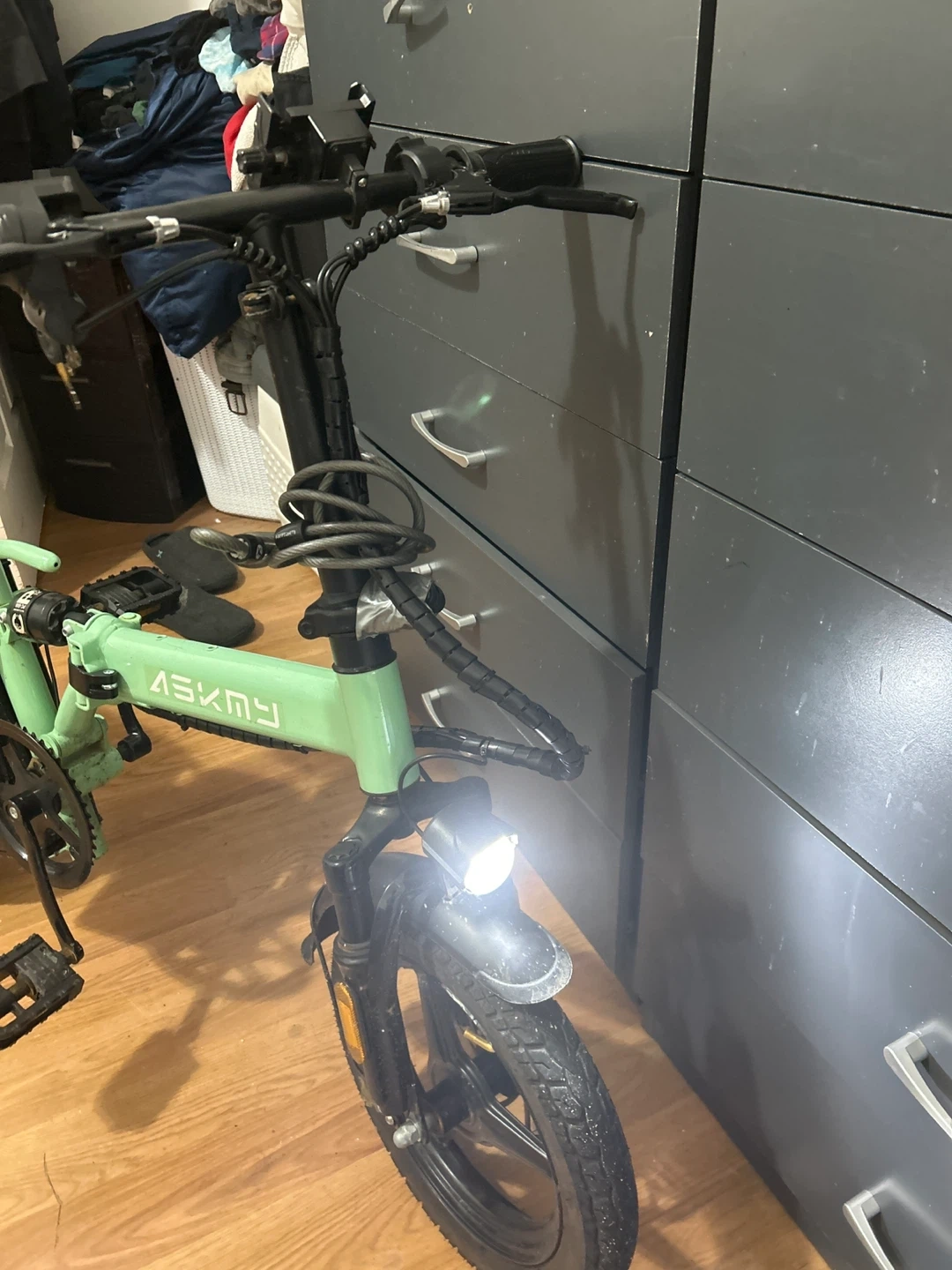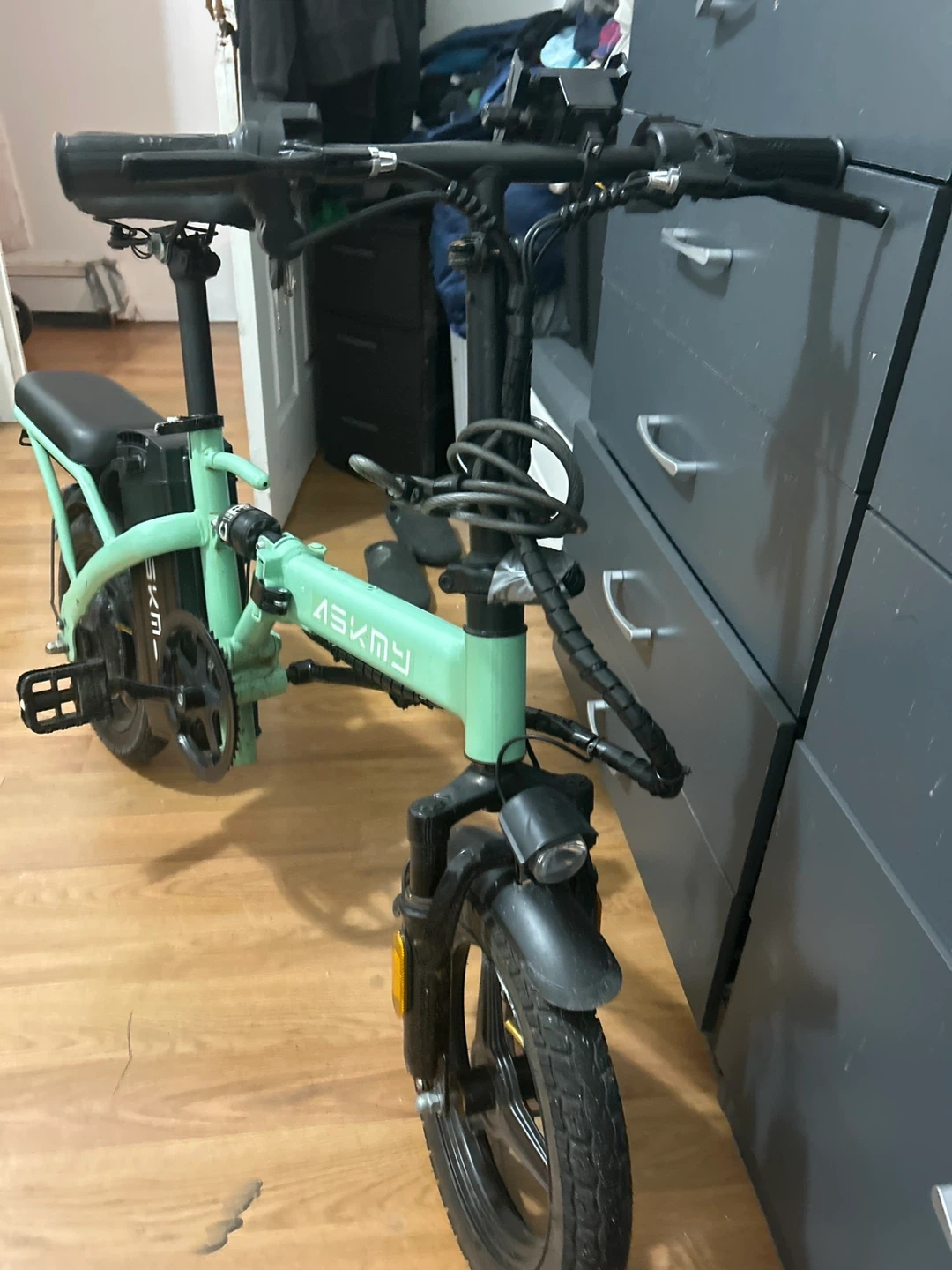 This is an ASKMY electric folding bike in a mint green color. It's a convenient way to get around town. It includes a battery and charger. Works very good