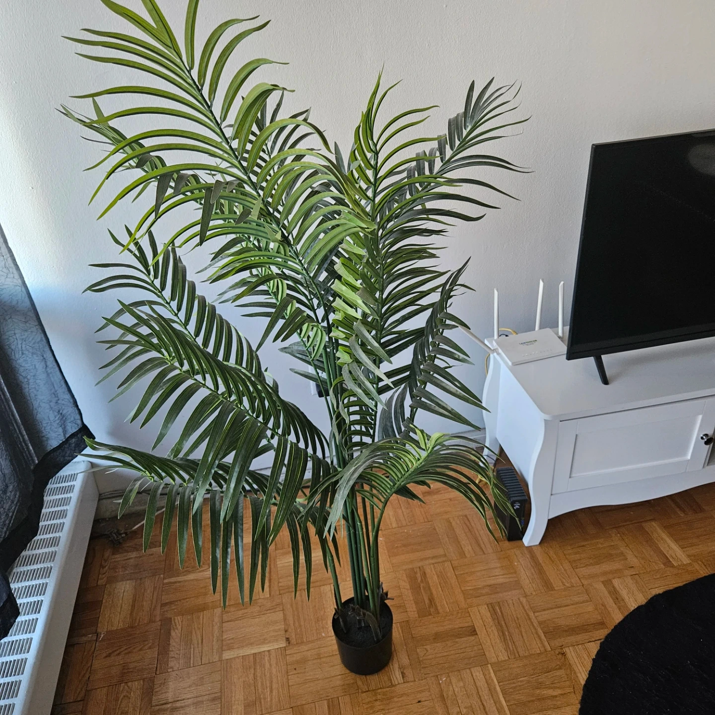 It's a faux areca palm plant in a black pot. This plant's leaves are a vibrant green. It's a great way to add some greenery to your space without any of the upkeep!