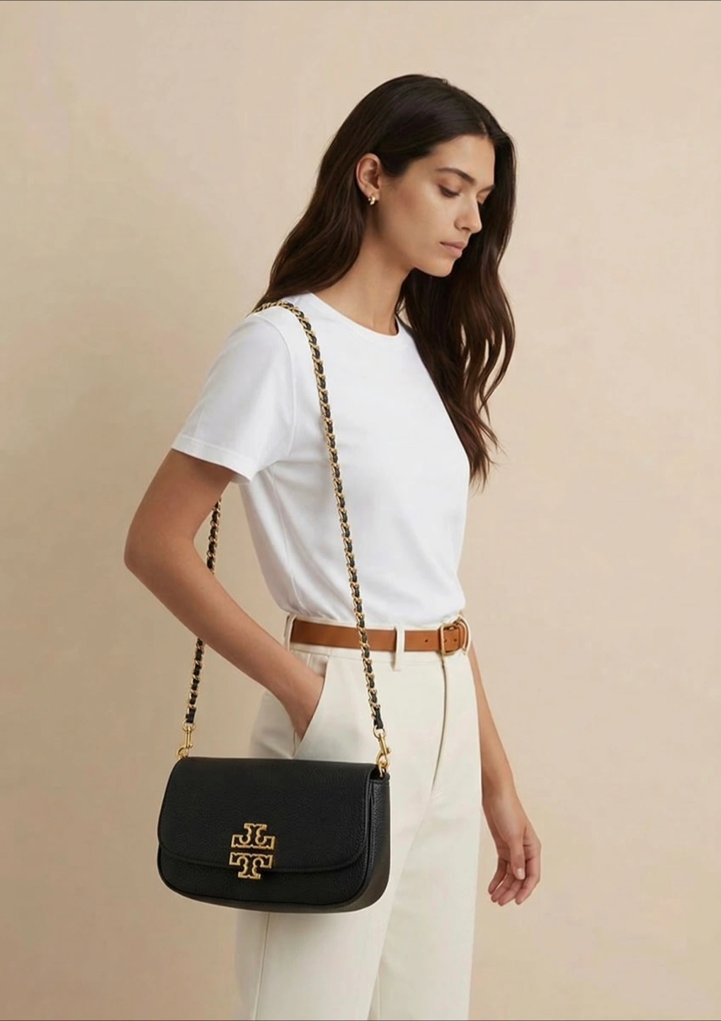 This is a Tory Burch shoulder bag in black leather with a chevron design. It features a gold-tone chain strap and the signature Tory Burch logo hardware. It's a stylish accessory for any occasion.