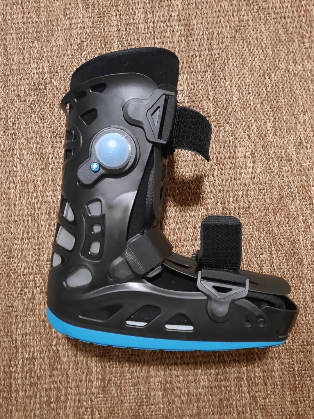 This is a walker boot brace designed for ankle and foot support. It features adjustable straps for a secure fit and a padded interior for comfort. This type of brace is often used after injuries or surgery to protect the foot.