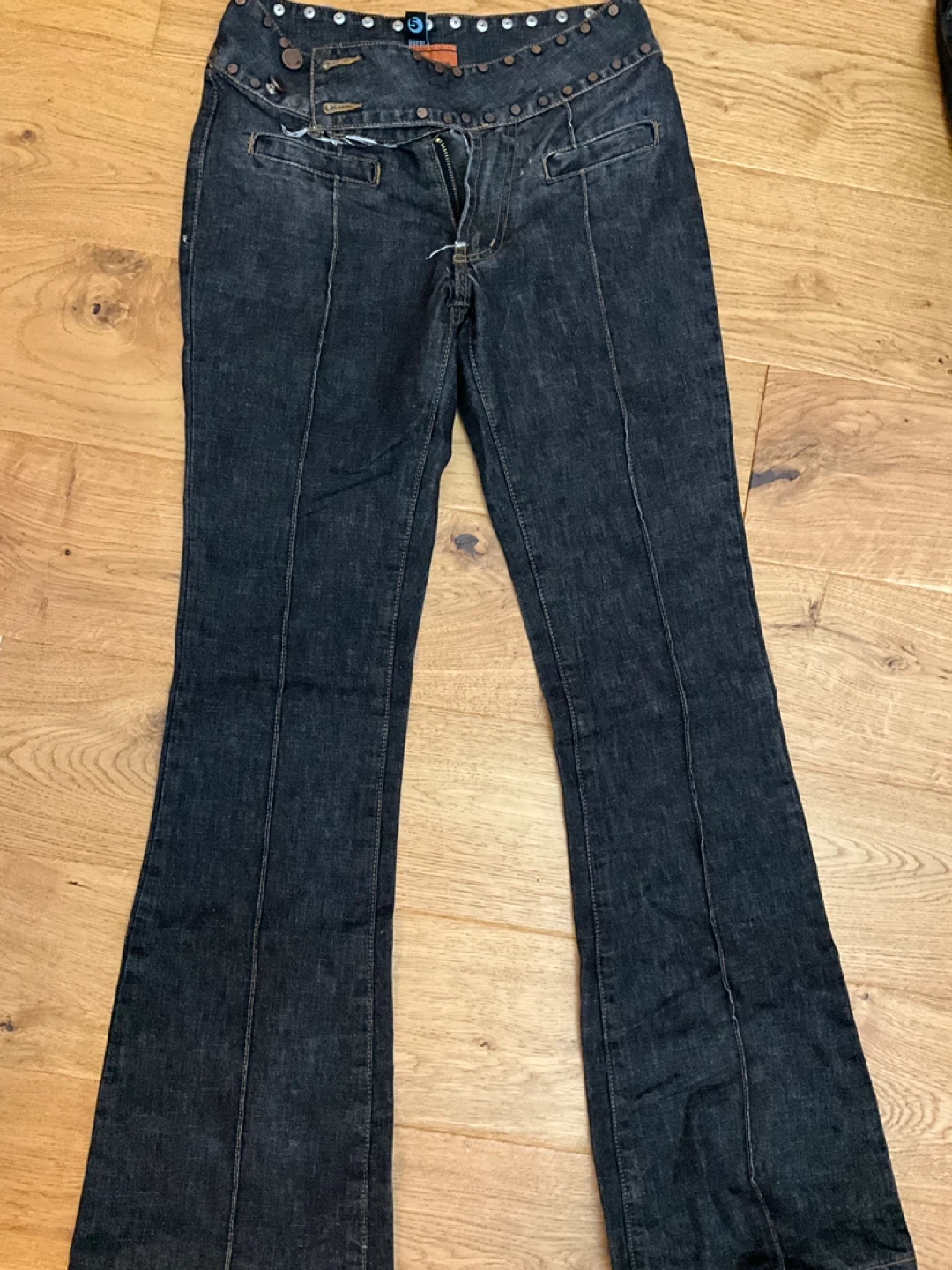These are dark wash vintage Feng brand jeans. They're a stylish bootcut fit with decorative stud detailing along the waistband. Perfect for dressing up or down!