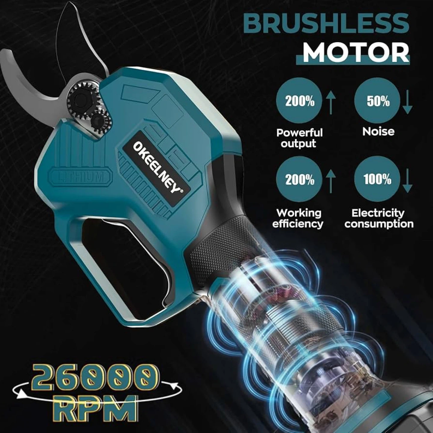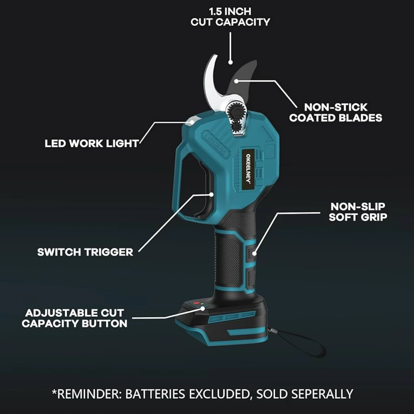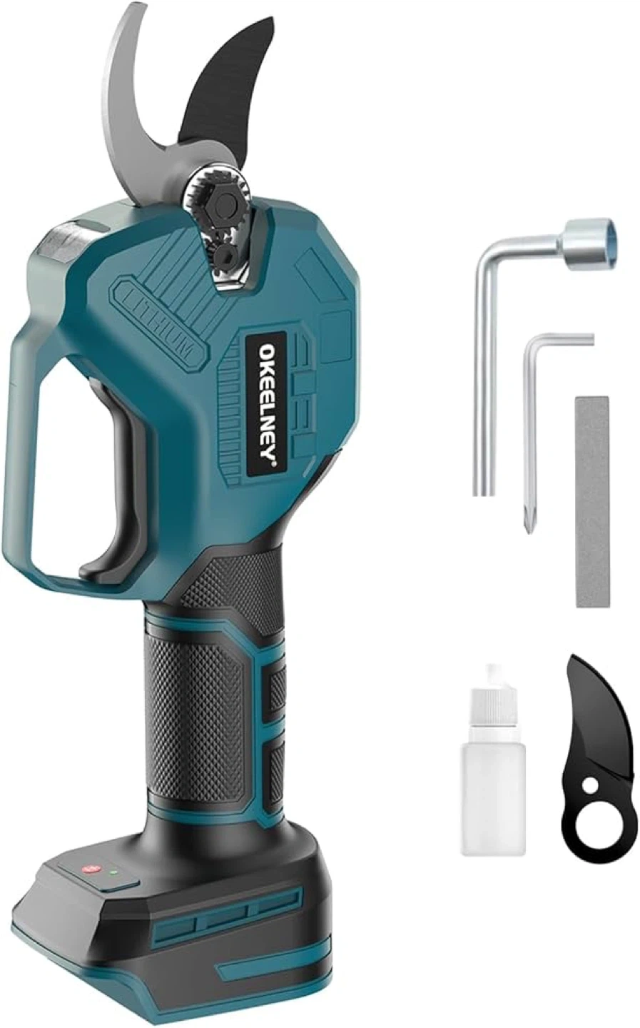 43Selling a brand new set of OKEELNEY 18V Lithium Pruning Scissors! Key features include: - Brushless motor - 1.5 inch cut capacity - Non-stick coated blades - LED work light - Non-slip soft grip - Adjustable cut capacity button It offers 200% more powerful output and working efficiency, and reduces noise by 50% and electricity consumption by 100% compared to other models. Batteries are excluded and sold separately. Instruction manual is included!