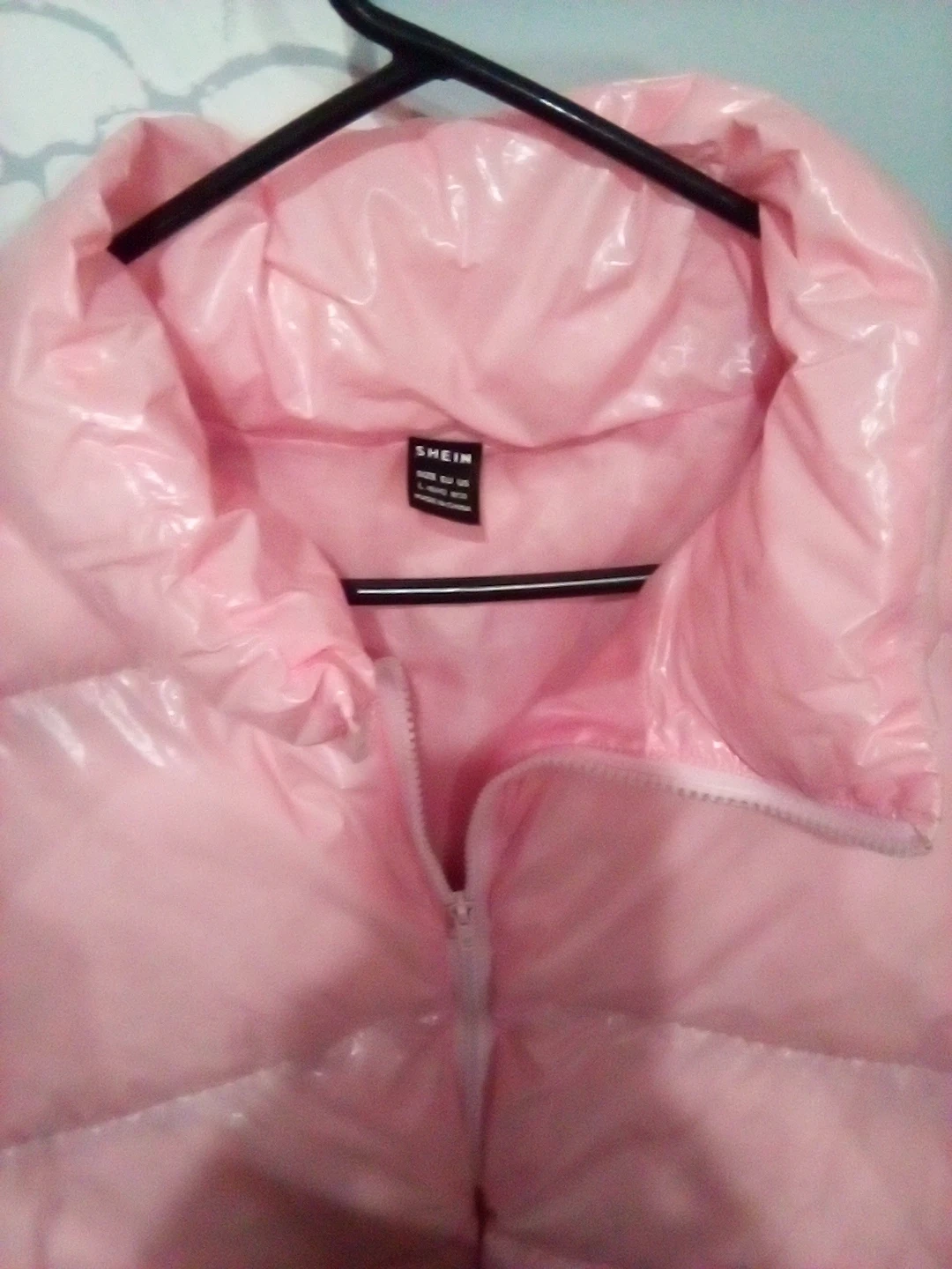 This is a pink, shiny puffer jacket from SHEIN. It's a cropped style with a zip-up front and a high collar. The material is glossy and water-resistant, perfect for cooler, damp days! Worn but in good condition & it's a Large like in petite/small females