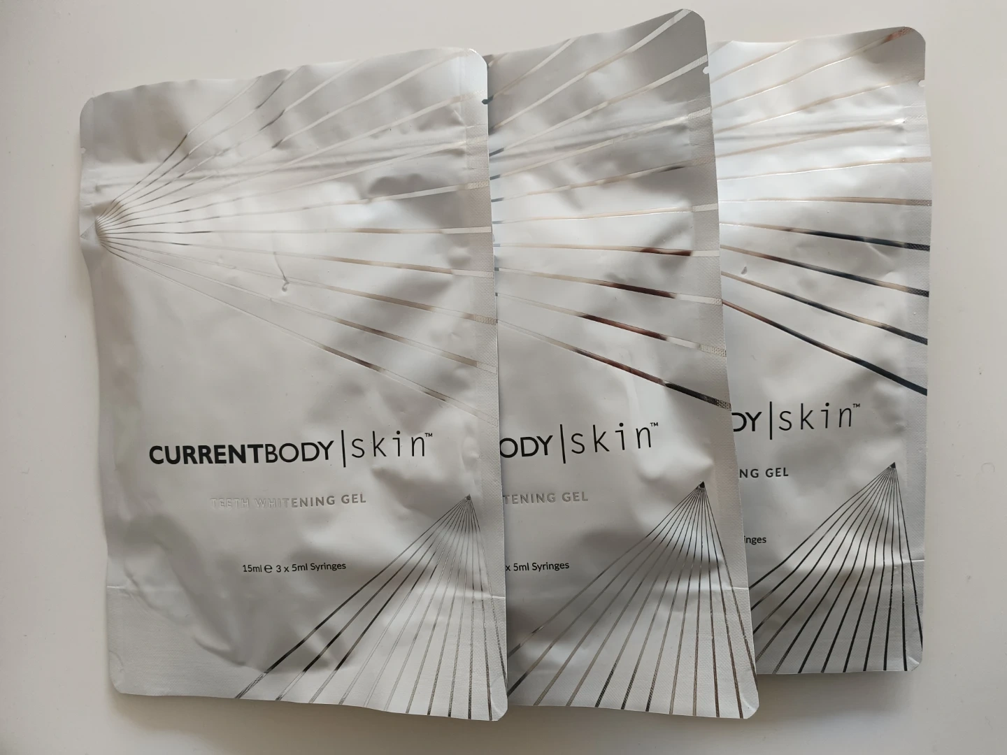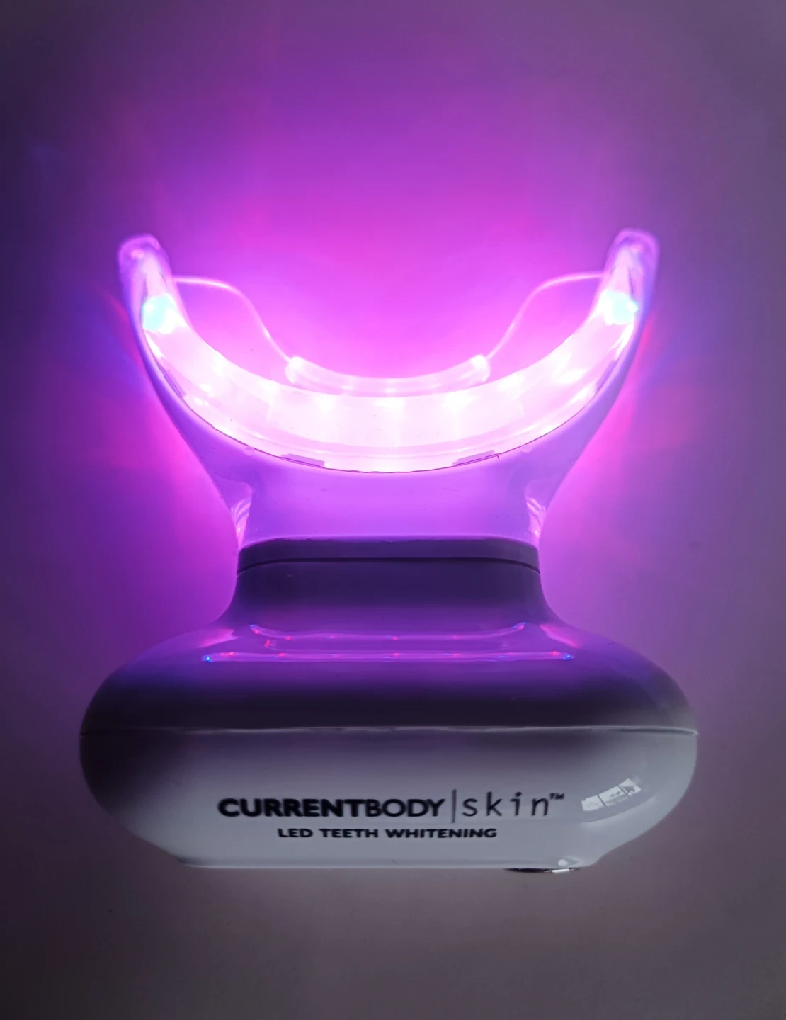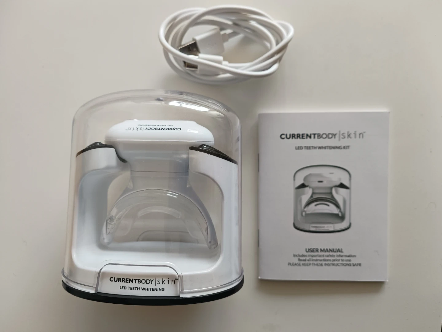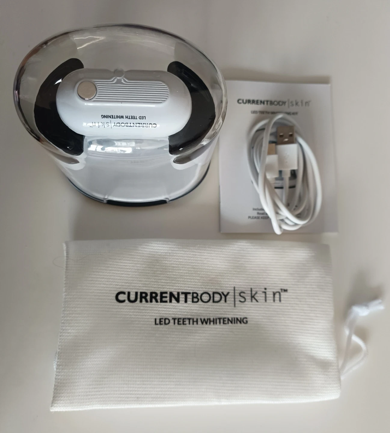 Complete CurrentBody Skin LED Teeth Whitening Kit. Includes the device, charging cable, user manual, and syringes of teeth whitening gel. It's designed for at-home teeth whitening.