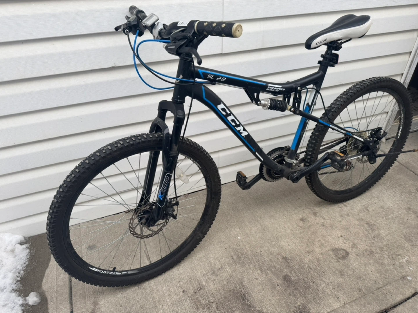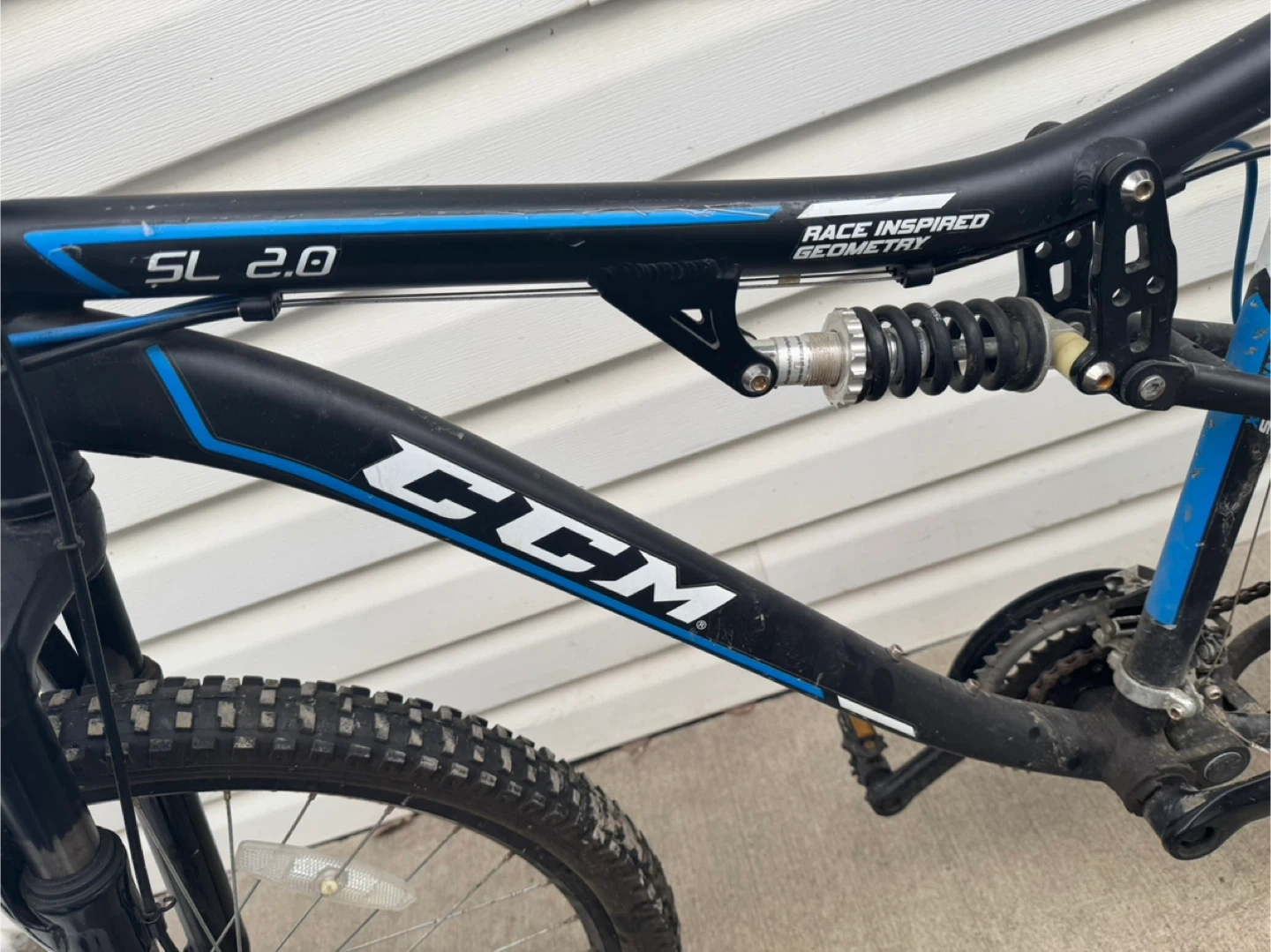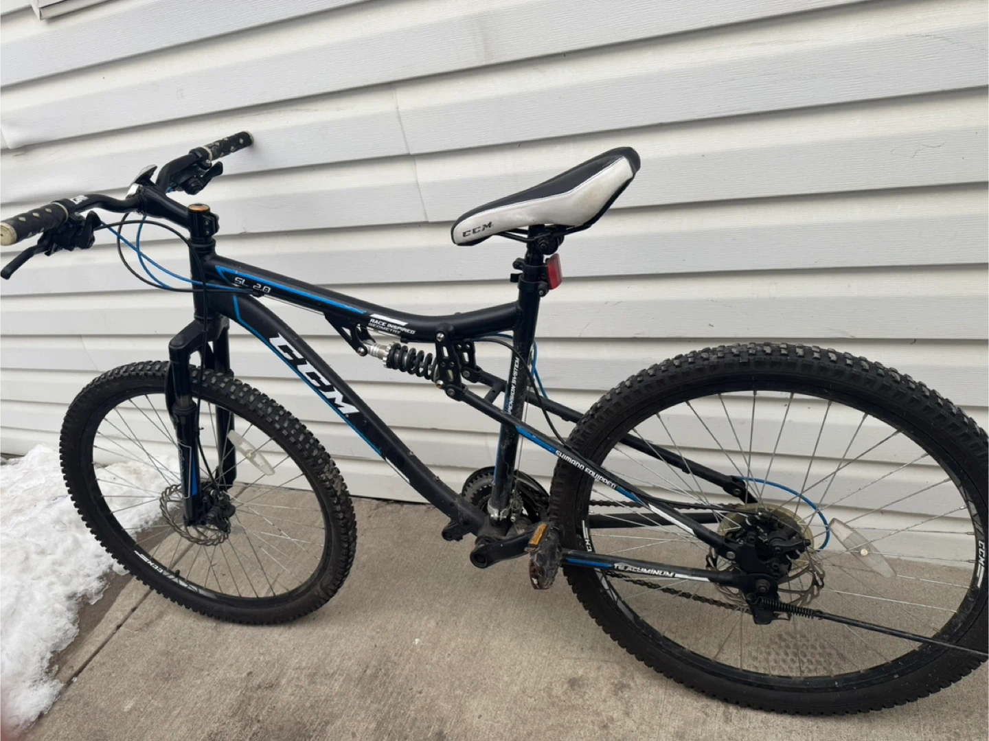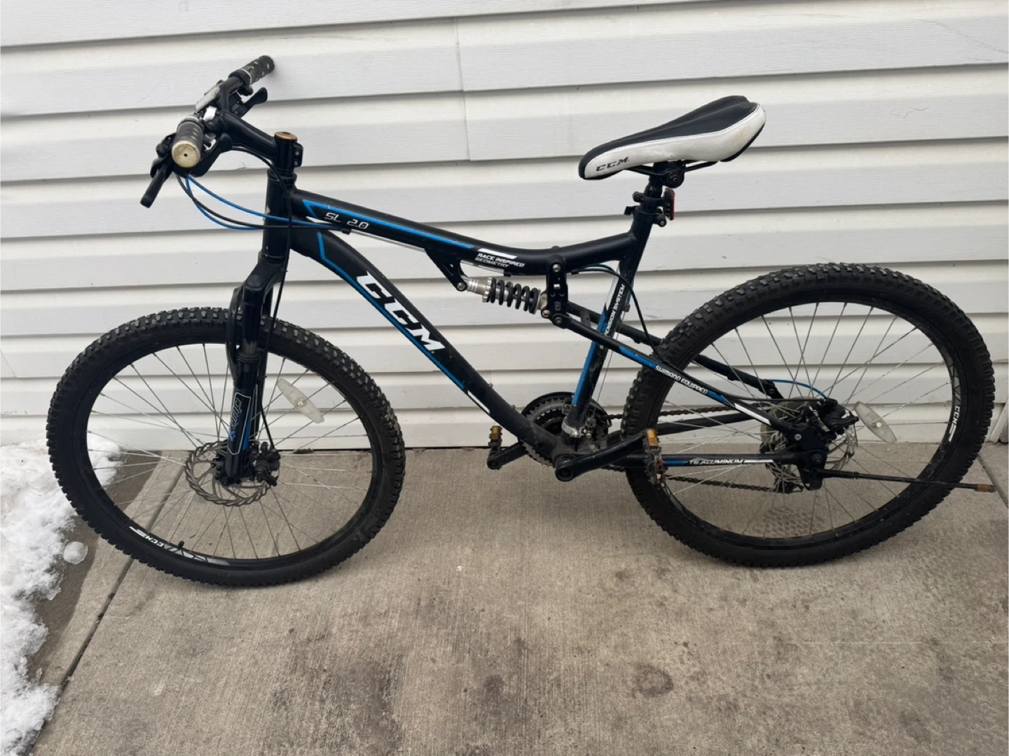 CCM Aluminum Full Suspension Mountain Bike with Disk Brakes , 21 speed , 26 inch wheels , 20 inch frame. Over $650 new. $120 cash. Firm price