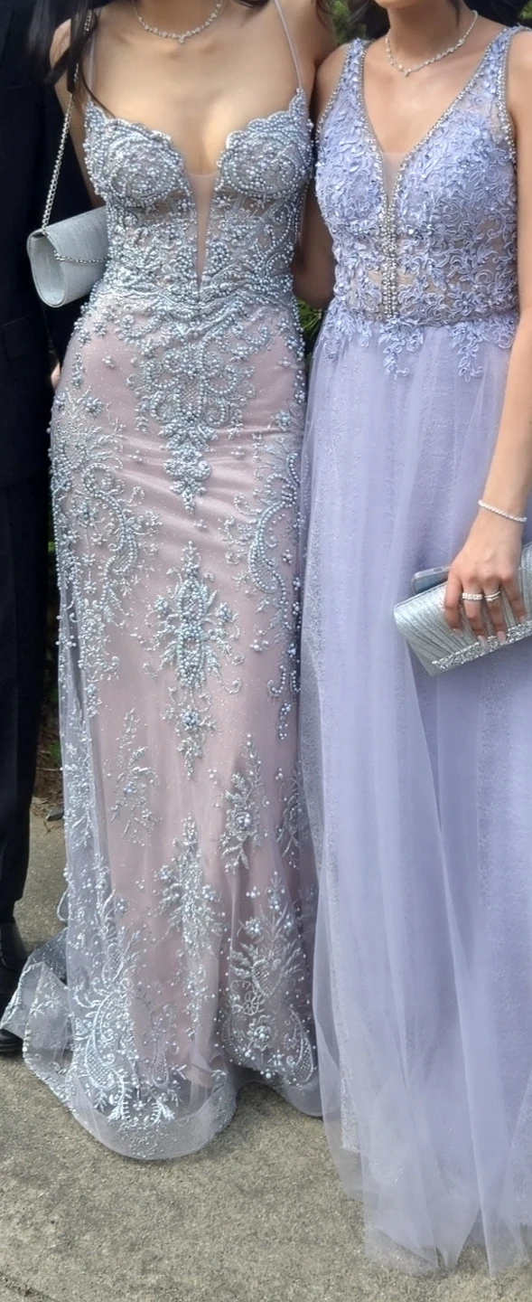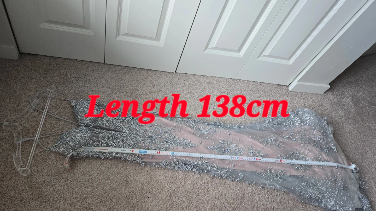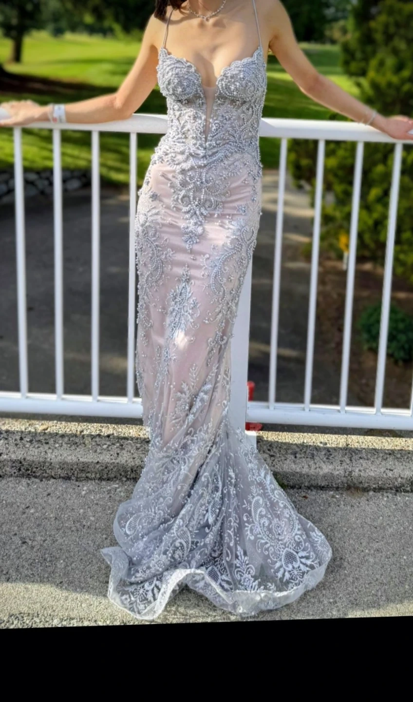 Stunning formal gown with intricate beadwork and lace detailing. It features a fitted silhouette and a flowing train. Made with delicate materials for a luxurious feel.