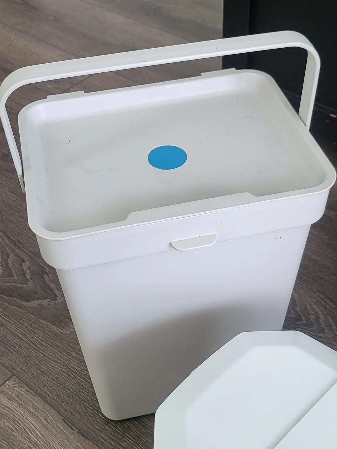 Three plastic bins, varying sizes and colours. Two off-white bins, one larger with a hinged lid and one smaller with a removable lid and carrying handle. One smaller beige bin with a removable lid and carrying handle. Great for organizing or waste disposal. IKIA