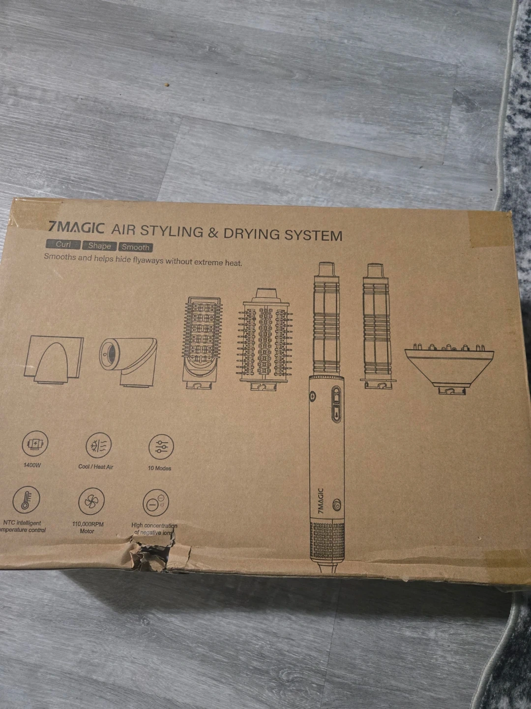 7MAGIC 7-in-1 hair styling and drying system. Includes multiple styling attachments for curling, shaping, straightening, and diffusing. Features 110,000 RPM motor and NTC intelligent temperature control. Comes with a travel case.