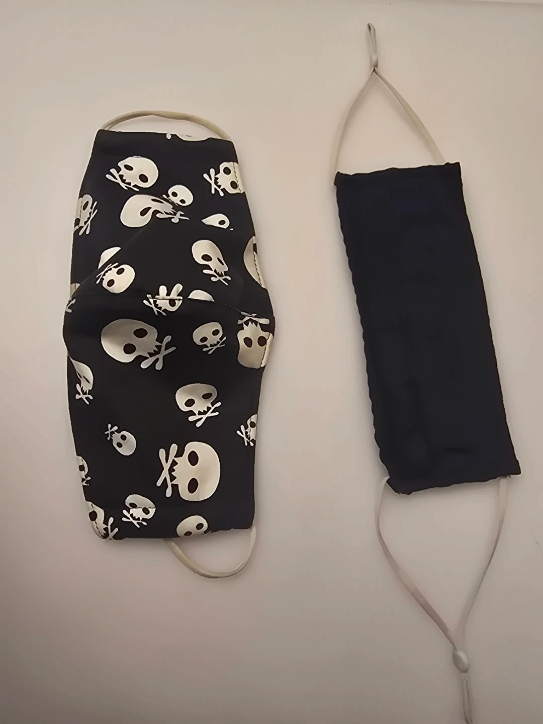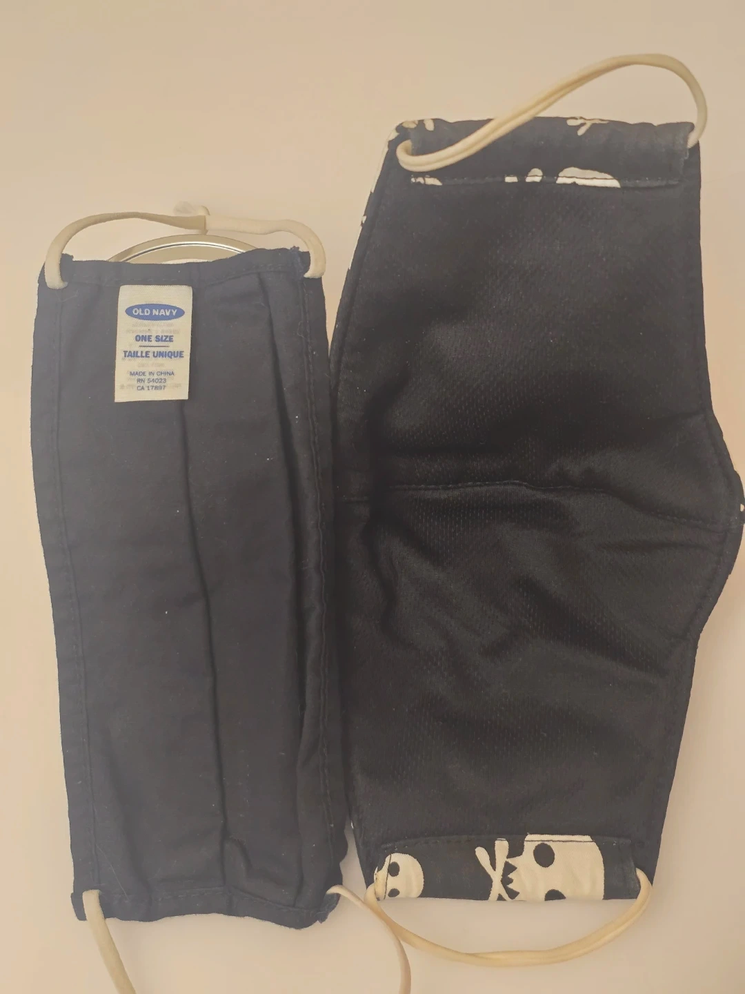 1 reusable Old Navy face mask and 1 skull face mask included, One mask is sold black and a rectangular size, while the other features a fun black and white skull print that is larger fitting that bumbs up over the nose.