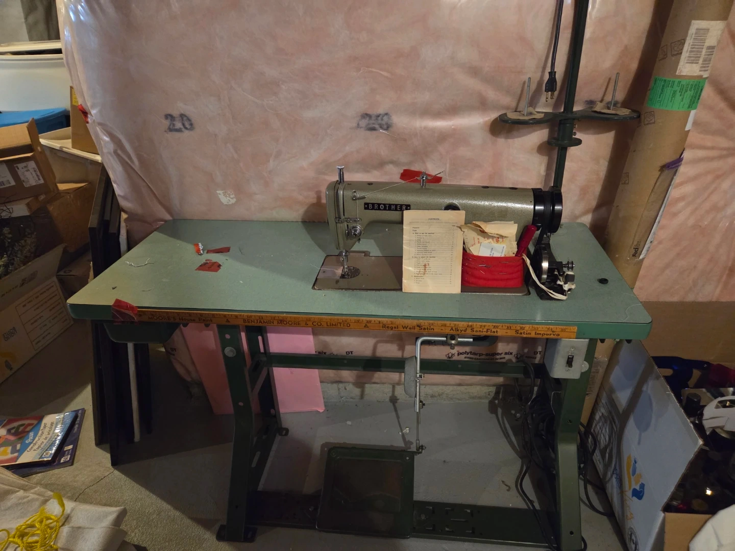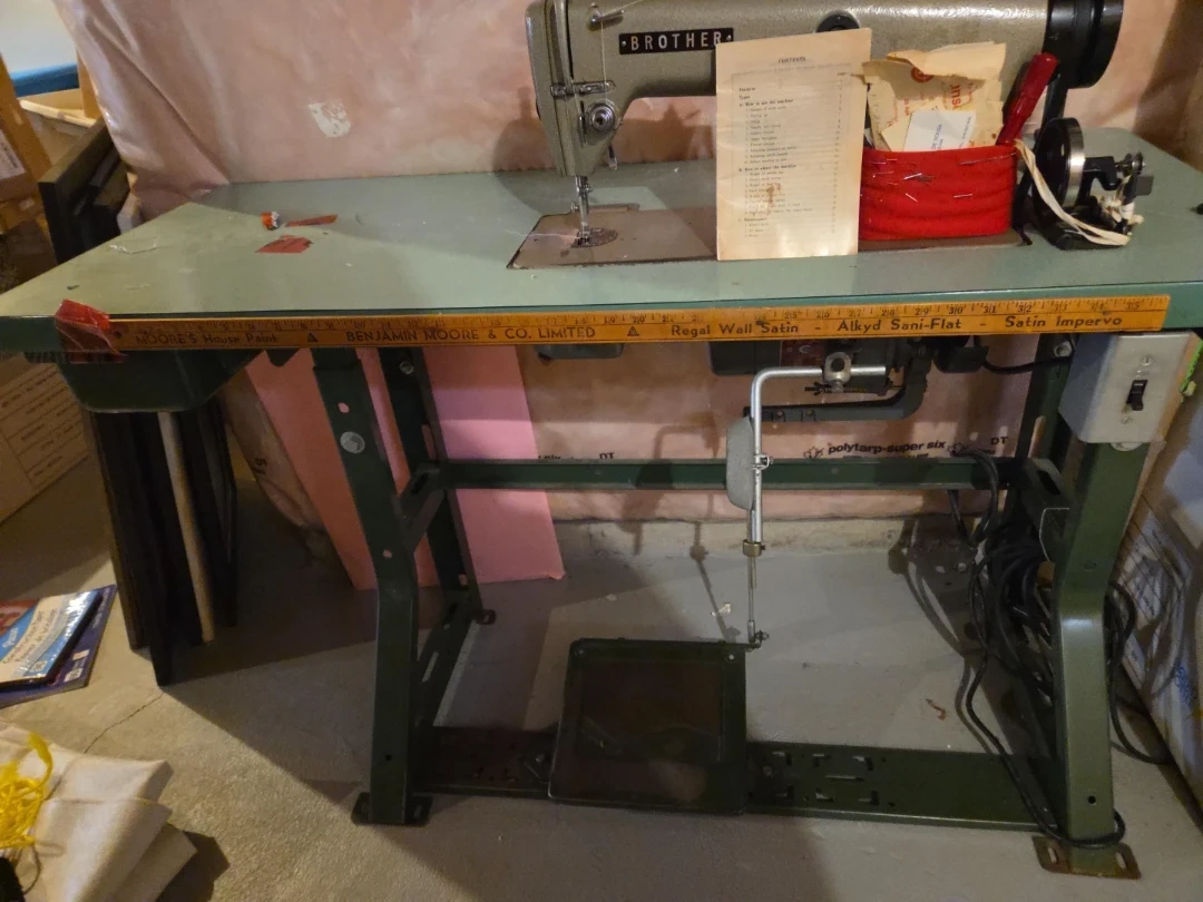 This is a Brother industrial sewing machine, complete with its table and foot pedal. It's a robust unit suited for heavy-duty sewing tasks. It works well and comes with original manual booklet