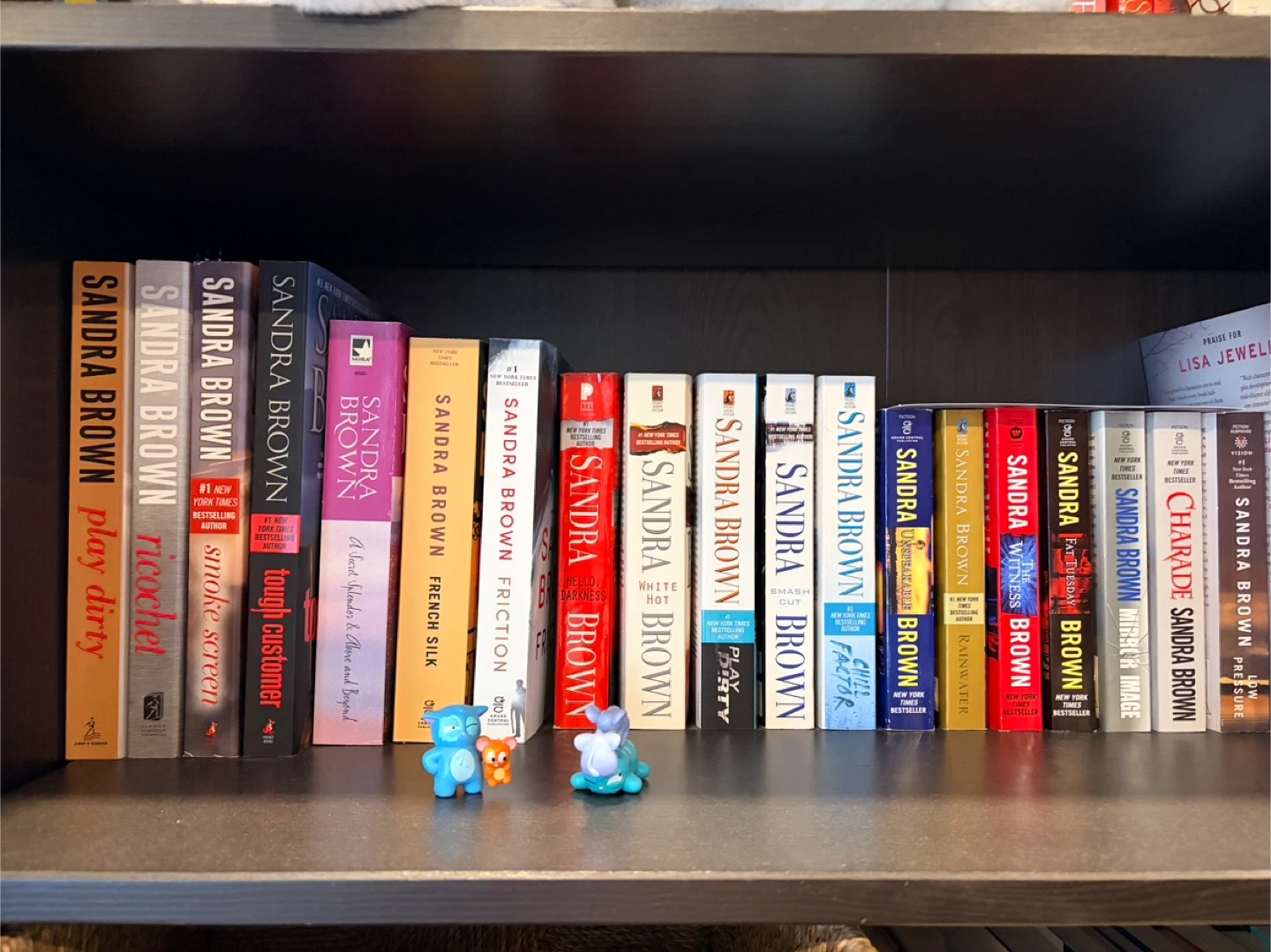 Collection of Sandra Brown novels. Titles include 'Play Dirty', 'Ricochet', 'Smoke Screen', 'Tough Customer', 'French Silk', 'Friction', 'Hello, Darkness', 'White Hot', 'Smash Cut', 'Chill Factor', 'Unspeakable', 'Rainwater', 'The Witness', 'Fat Tuesday', 'Mirror Image', 'Charade', and 'Low Pressure'.