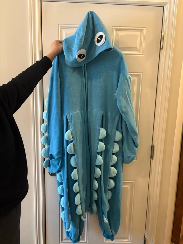 This cozy, medium-sized onesie features a full zip-up front, a comfy hood with googly eyes, and a playful array of plush tentacles that are sure to turn heads. It's in great condition and ready for its next adventure, whether it's a costume party, a cozy night in, or just some silly fun. Specifications: Brand: Funziez by Silver Lilly Size: Medium Material: Plush, soft fabric Features: Hood with eyes, full zip, attached tentacles Perfect for children or adults!