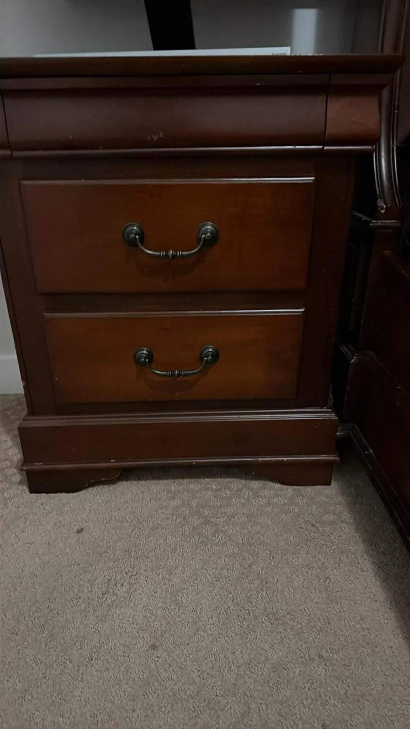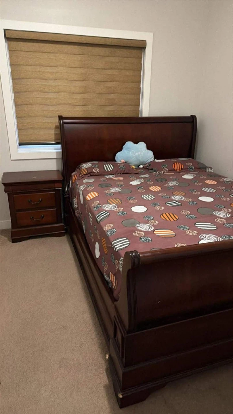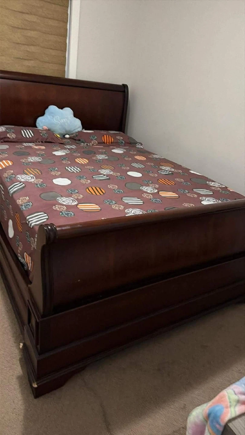 Dark wood sleigh bed frame with a matching two-drawer nightstand. Solid wood construction. Includes bed frame and nightstand. The bed frame is a queen size and it comes with mattress as well so it’s complete set.