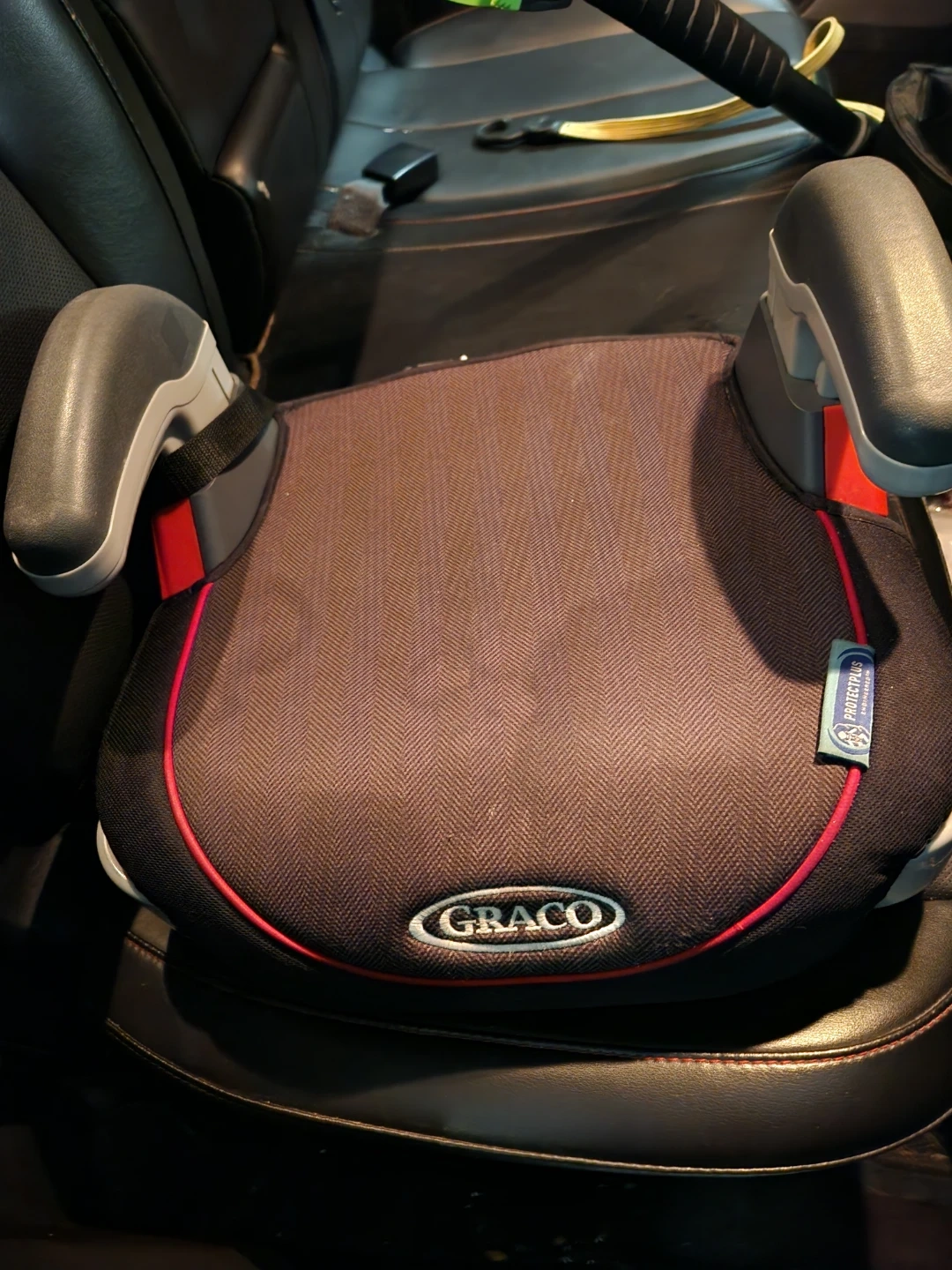 This is a Graco booster car seat in dark grey with red trim. It's designed for growing kids needing a little extra height for seat belts.
