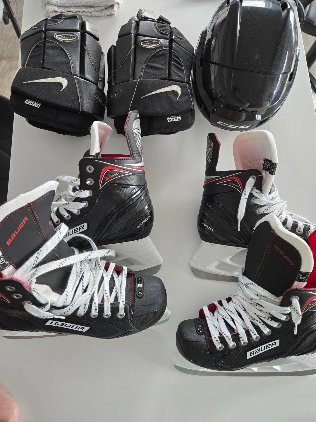 Black Bauer Vapour ice skates with red accents. Includes a CCM black helmet and black Nike hockey gloves. Skates were both only used once. Helmet is lightly used, gloves are heavily used but vintage and great.