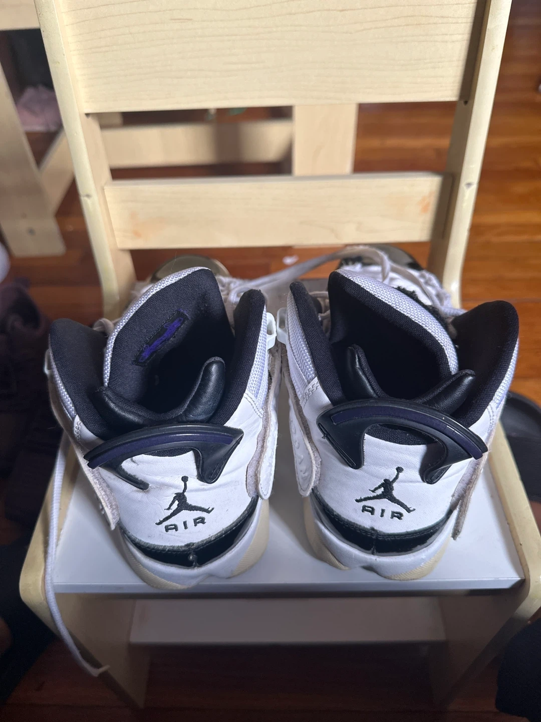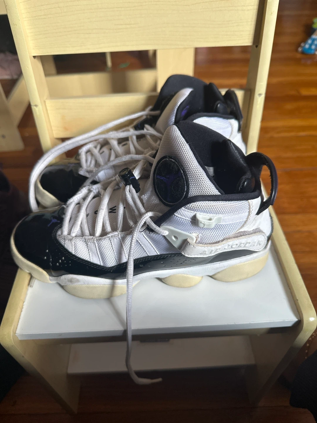 Jordan 6 Rings men's basketball shoes. Features a mix of white, black, and purple. Iconic design with visible Air cushioning. Lace-up closure for a secure fit.