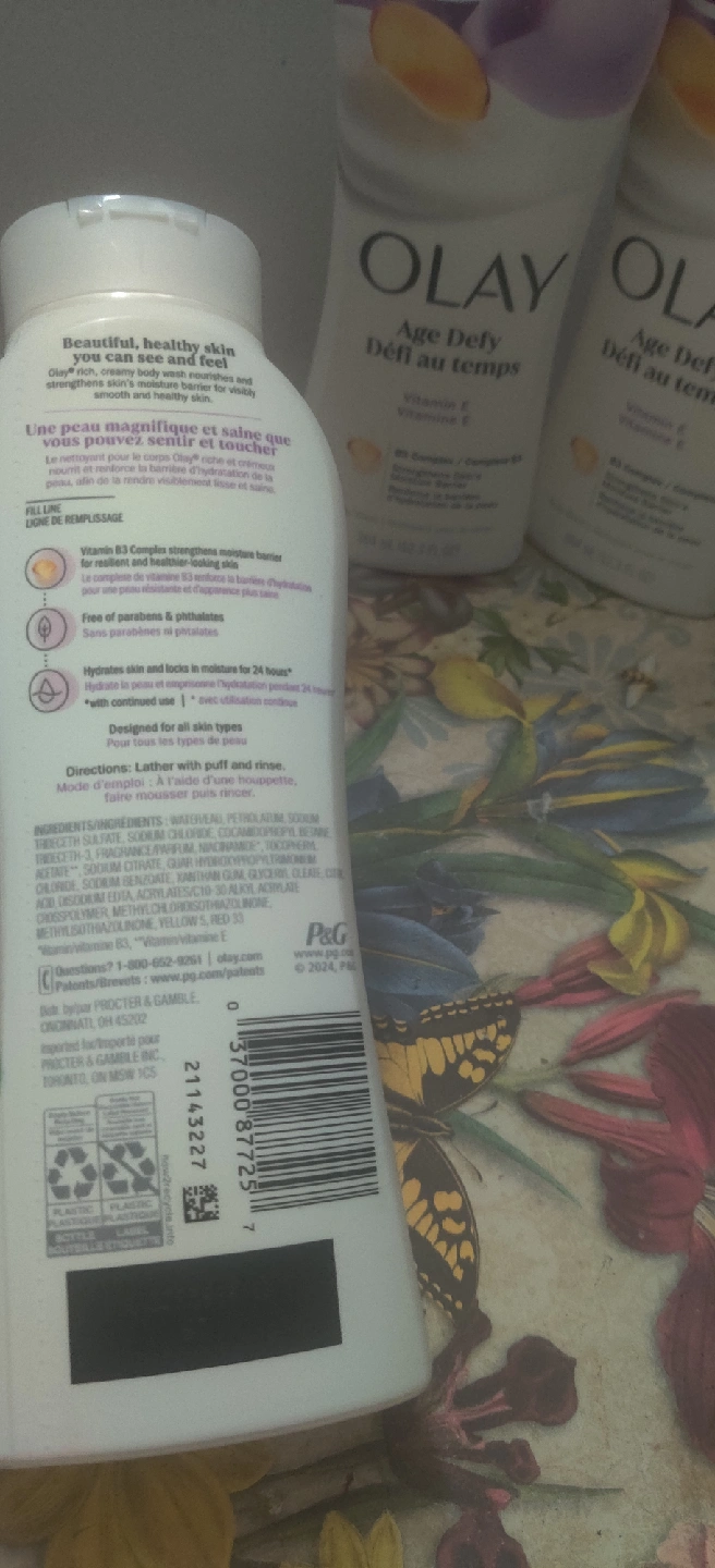 1000+I'm selling OLAY Age Defy body wash with Vitamin E. It strengthens the skin's moisture barrier and hydrates skin and locks in moisture for 24 hours. Designed for all skin types. 364 mL (12.3 FL OZ)