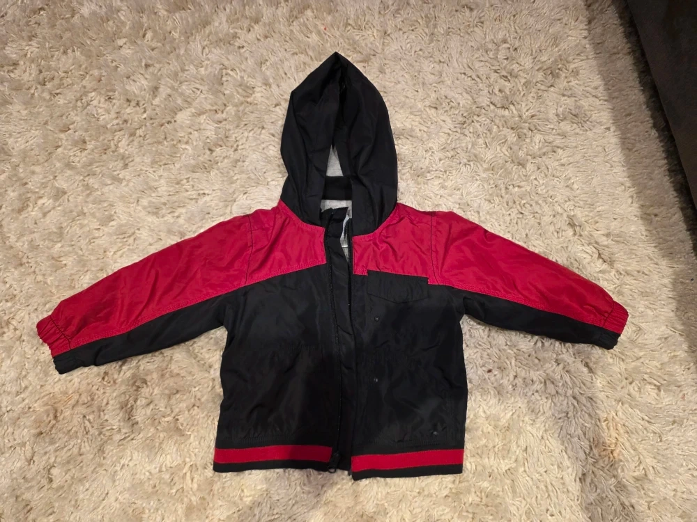 60A cute toddler jacket from Old Navy! It's a size 2T and has a hood, perfect for cooler weather. The jacket is black and red.