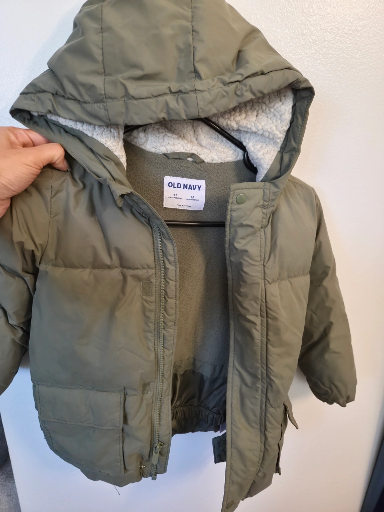 10Selling an Old Navy puffer jacket for a toddler, size 4T. It's a nice olive green colour and is water-resistant. Perfect for keeping your little one warm and dry!