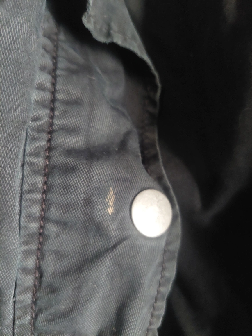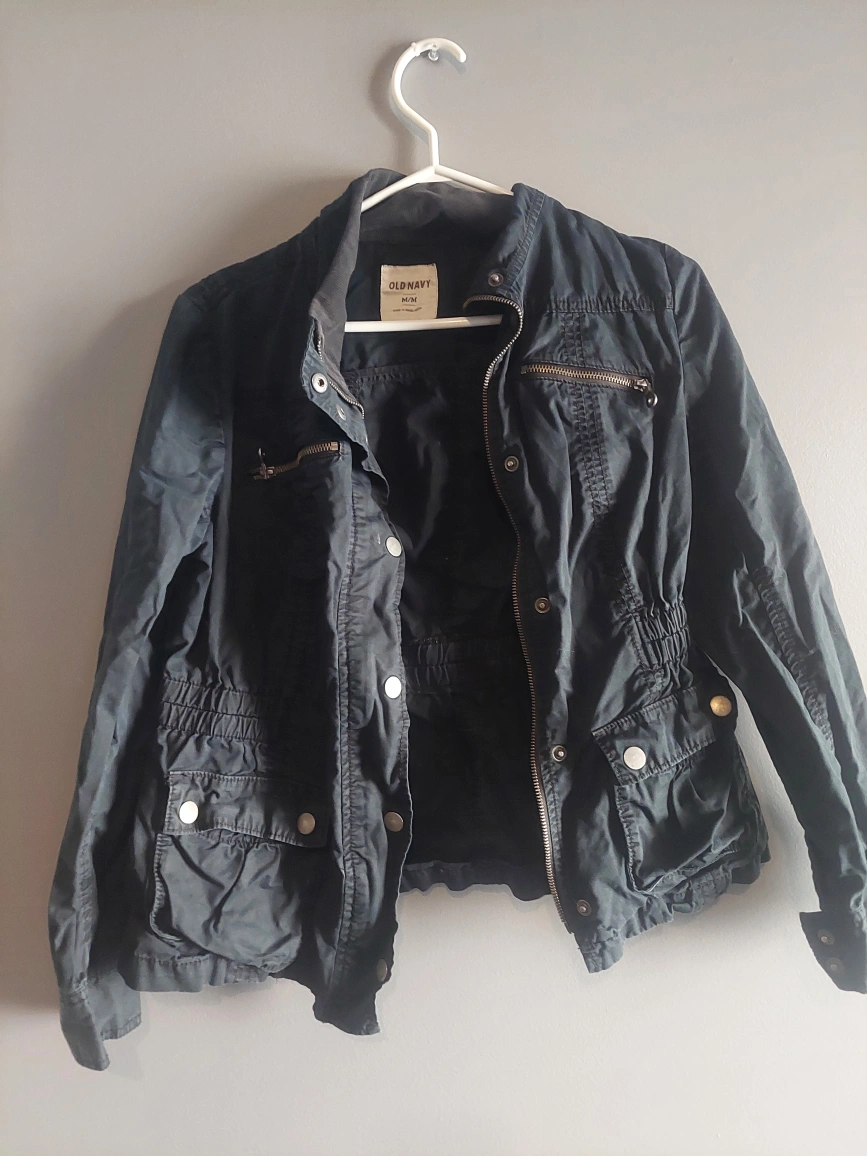 Selling an Old Navy black jacket in size M. It's a stylish and versatile piece! There's a small mark on the front, as pictured.