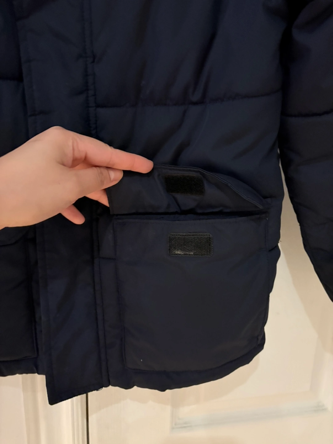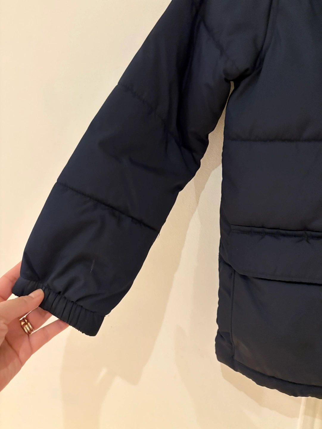987Navy blue puffer jacket. Size 5/6. Hooded. Two front pockets. Good used condition.