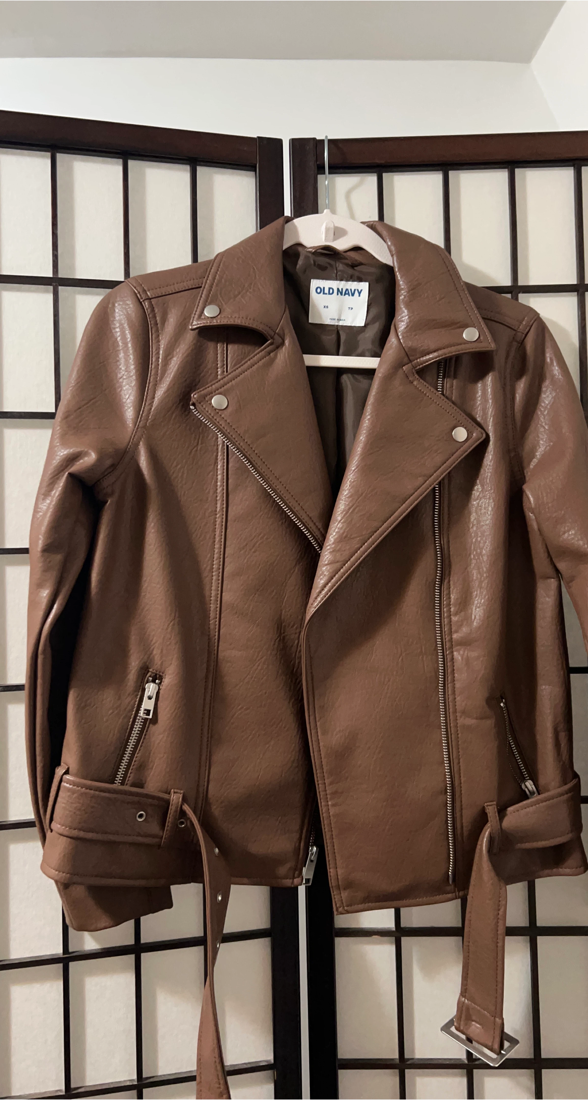 Selling a stylish Old Navy faux leather moto jacket in a beautiful brown colour. It's in excellent condition and size XS. Perfect for adding a bit of edge to any outfit!