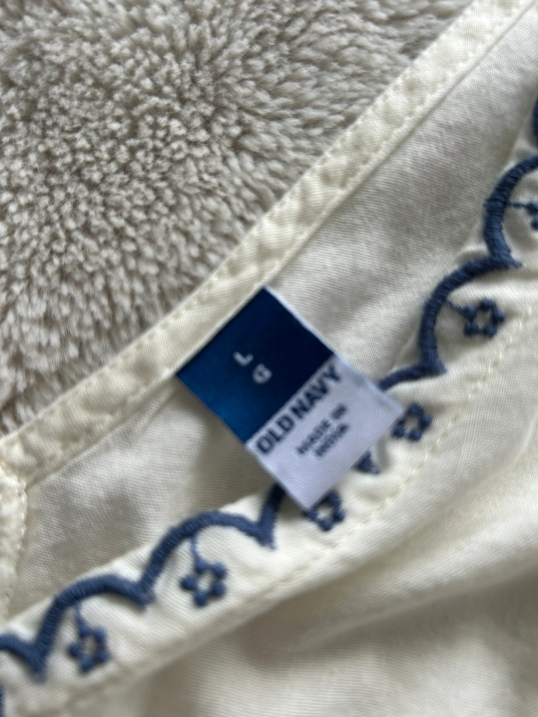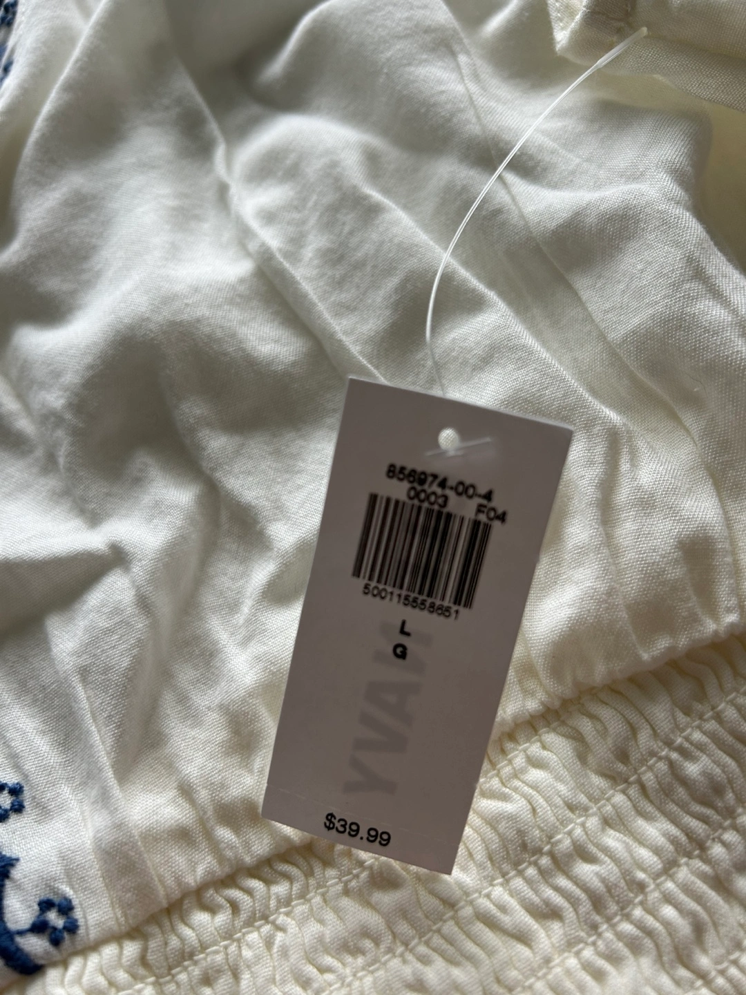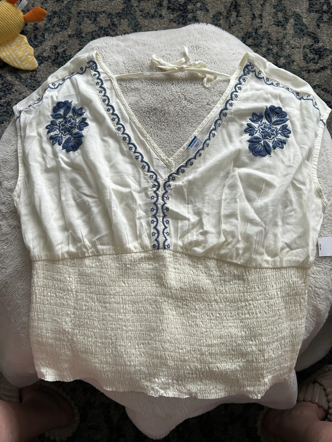 Creamy, textured top. Sleeveless. Featuring a V-neck, embroidered details, and elastic waist. A great piece for warm weather.