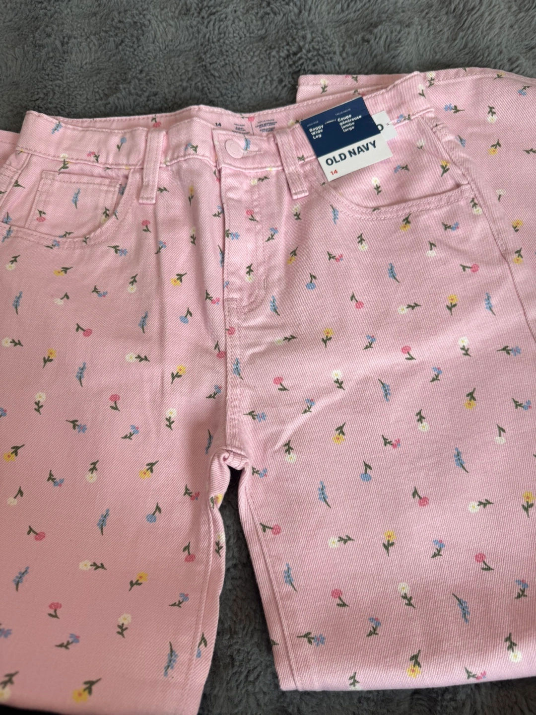 These jeans feature a lovely floral print. They have a high rise and a wide leg style. Perfect for a relaxed daytime look, offering both comfort and style.