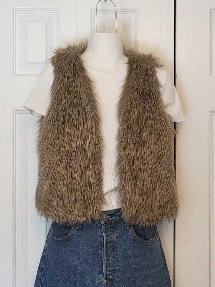 29Brown faux fur vest. Edge to edge style. Size: Large Fits: 10-12 years Pit to pit: 17 inches Length: 19.5 inches 67% Acrylic 18% Modacrylic 15% Polyester Liming: 100% Polyester Excellent condition, hardly worn.