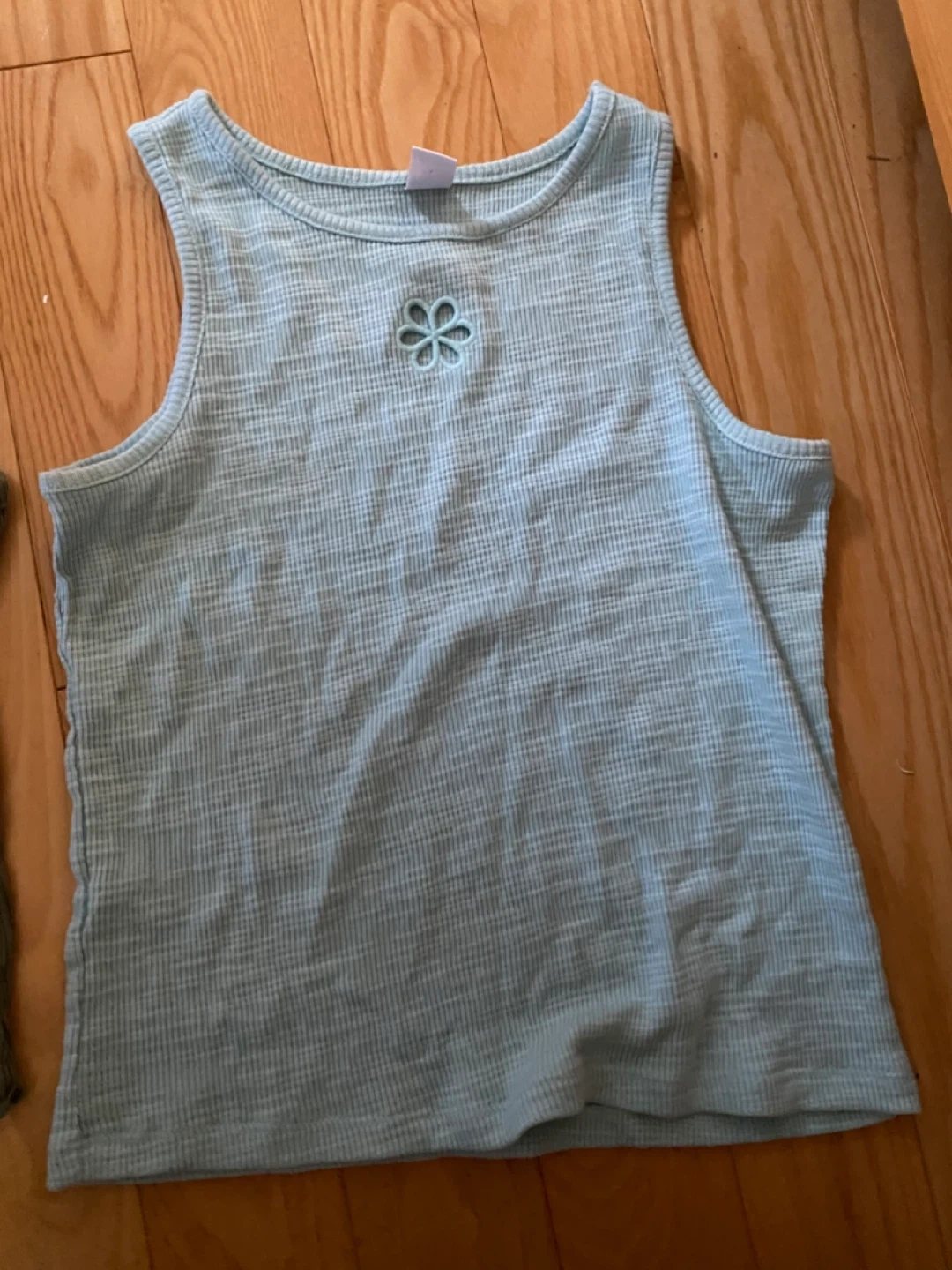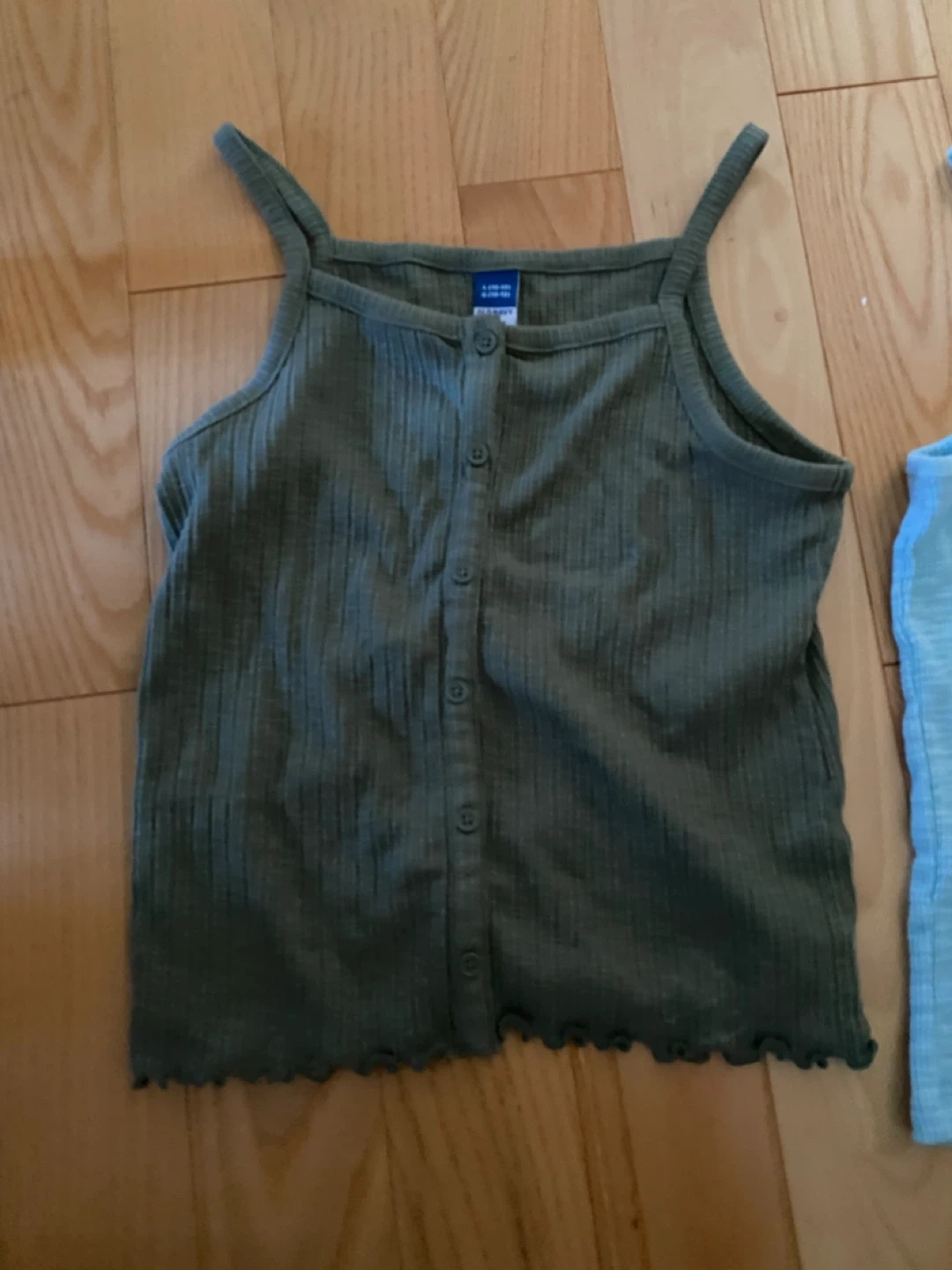 Two cute tank tops for girls! One is a light blue with a small flower design, and the other is an olive green button-up style with lettuce trim. Light blue tank is size XL (14-16) and olive green tank is L (10-12). From Old Navy and in great condition for your little one ☺️