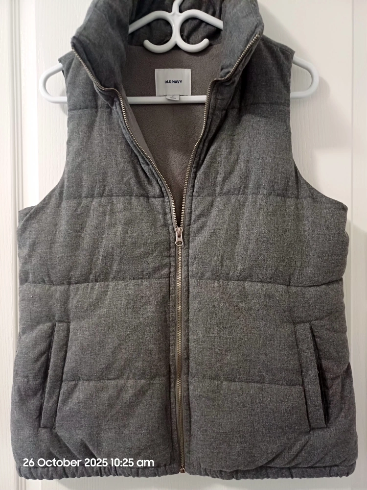 15Selling a cozy grey puffer vest from Old Navy! It's in great condition and perfect for layering during the cooler months. The vest features a full zip closure and handy pockets. It's a versatile piece that can be dressed up or down!