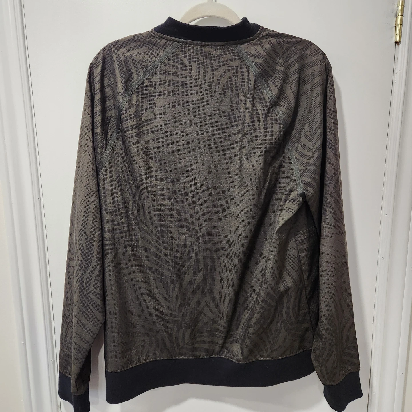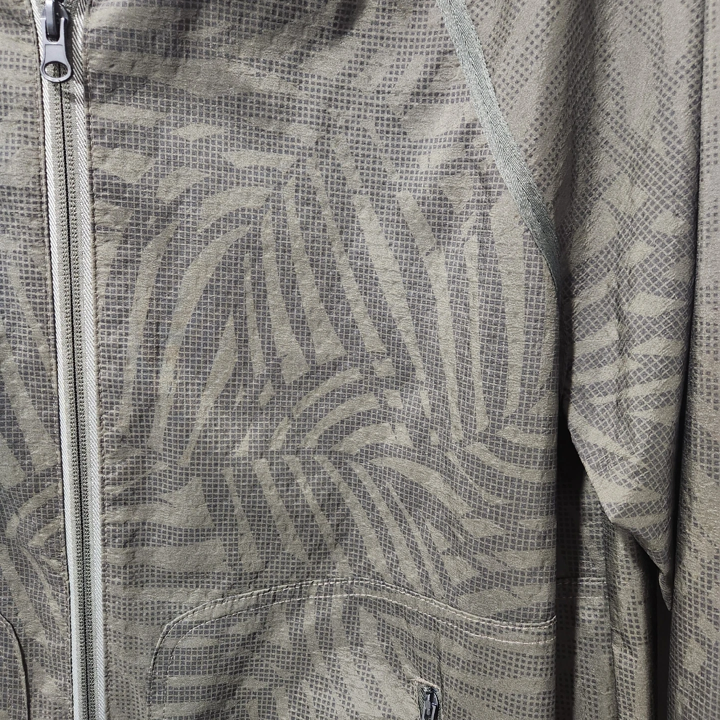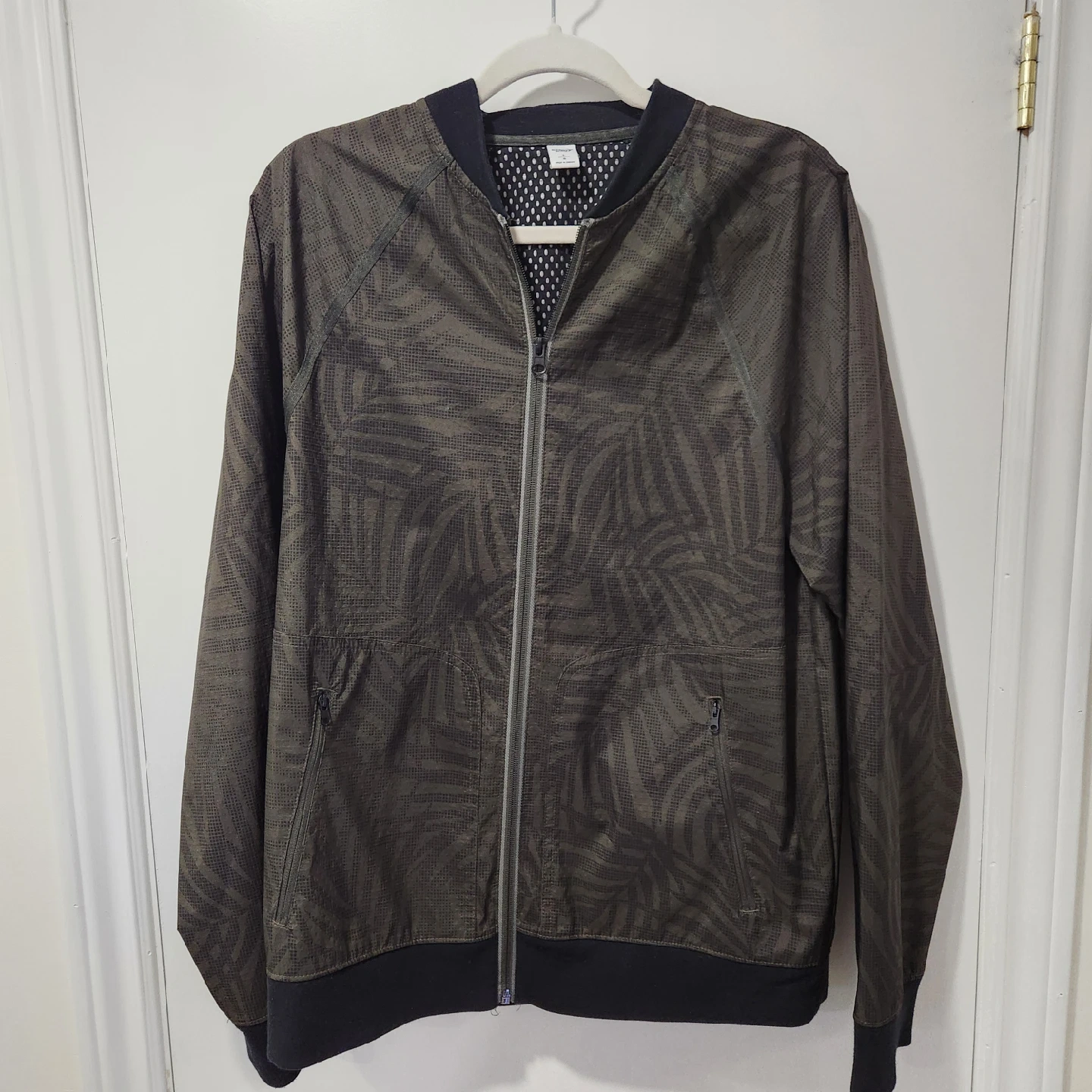 10Old Navy Men's Green Bomber Jacket Dark army green with leaf pattern. Bomber style jacket, zips up the front. No hood. Waterproof material with mesh lining. Zippered pockets in the front. Size L from Old Navy Pit to pit: 56cm, Length: 72cm